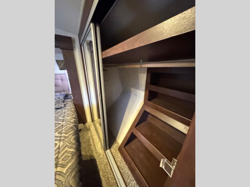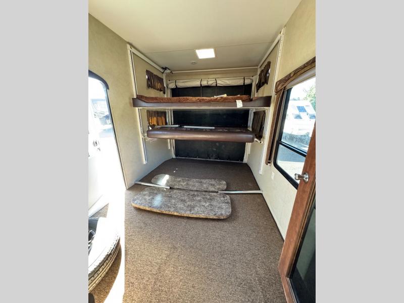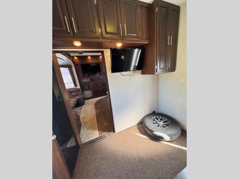 In the garage area of the fifth wheel there are electric beds. Along one wall in the garage you will find overhead cabinets.