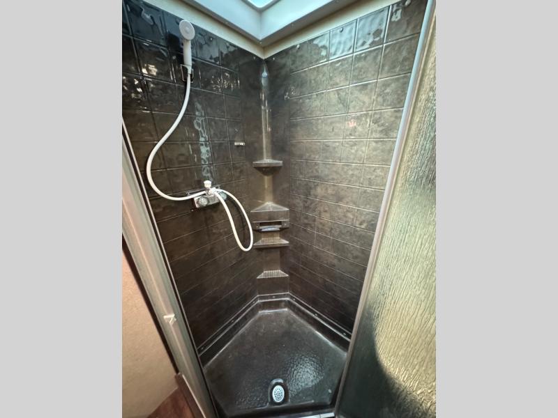 As you step up the stairs, the bathroom is on the left. Inside the bath there is a toilet, corner shower, and sink. The bathroom also has a private entrance into the bedroom.