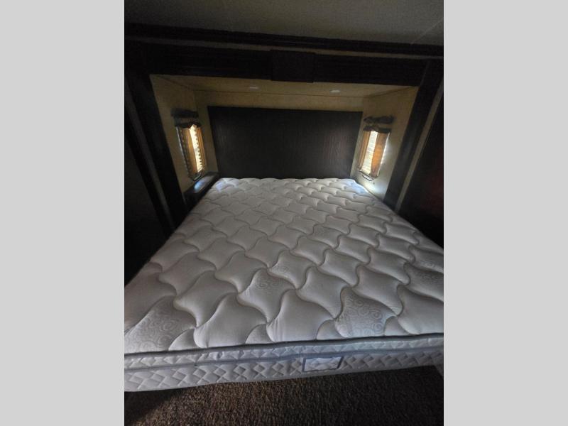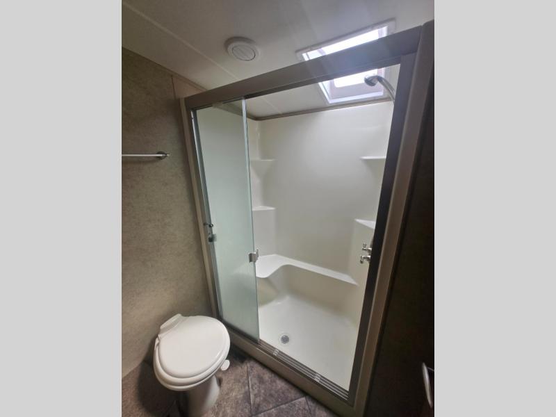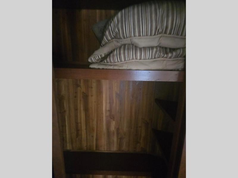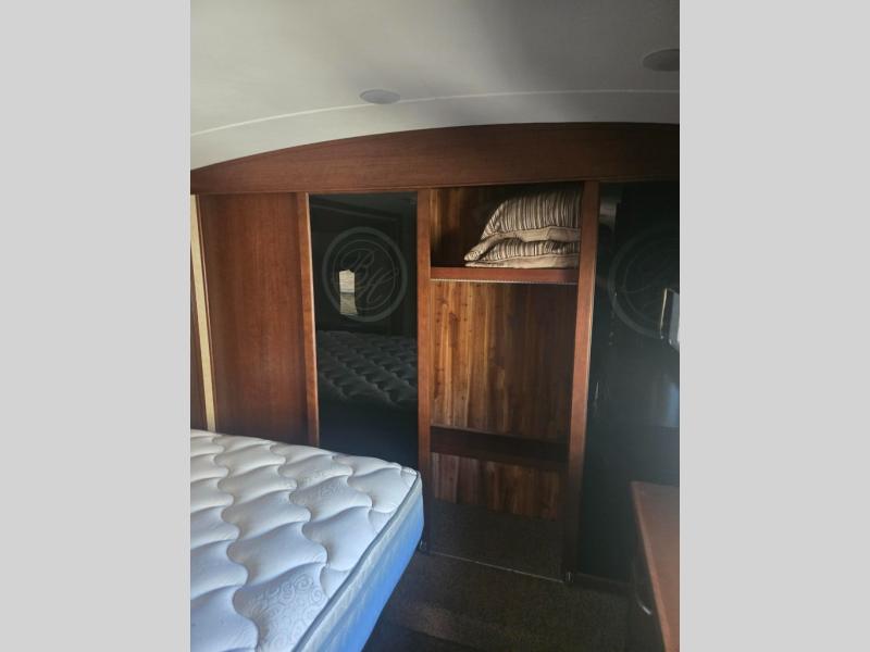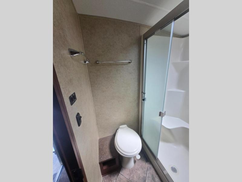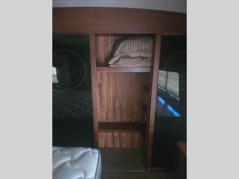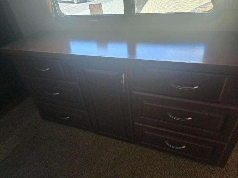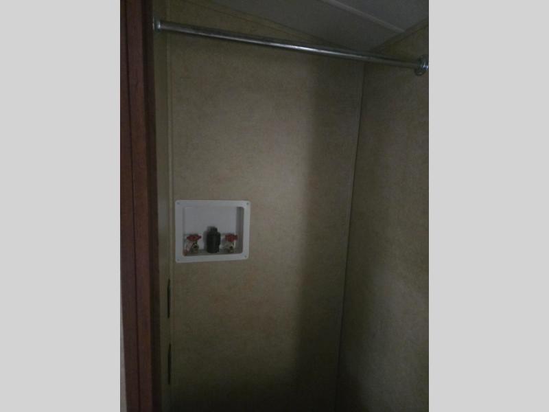 As you step up the stairs, you will come to a side aisle bath. In the bathroom there is a toilet, shower, and sink. The bedroom offers a queen bed slide. You will also see a washer and dryer preparation. The front wall of the fifth wheel you will find shelves, and a wardrobe, which provides plenty of storage. There is also a dresser in the bedroom.