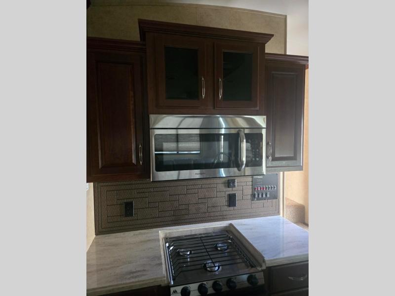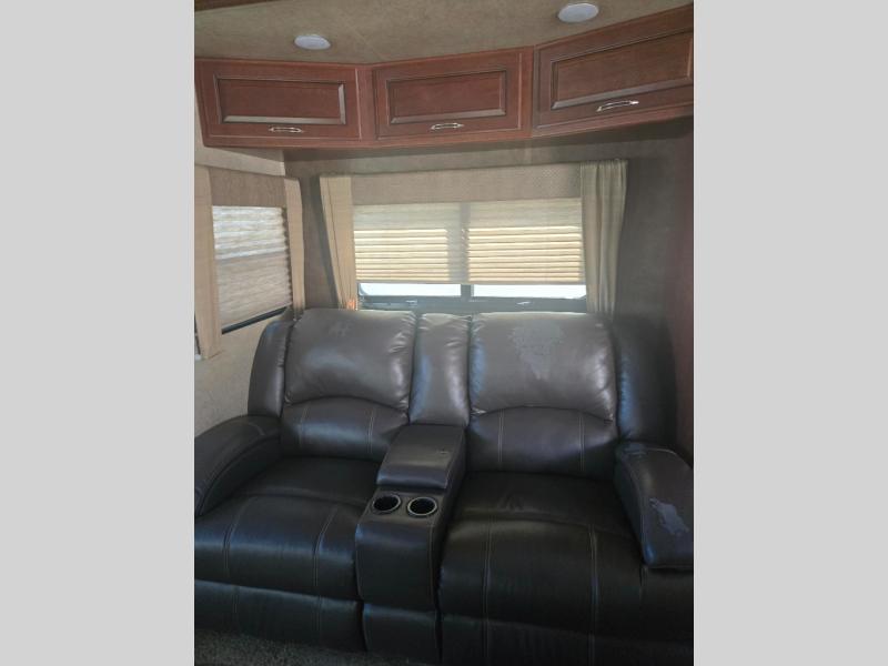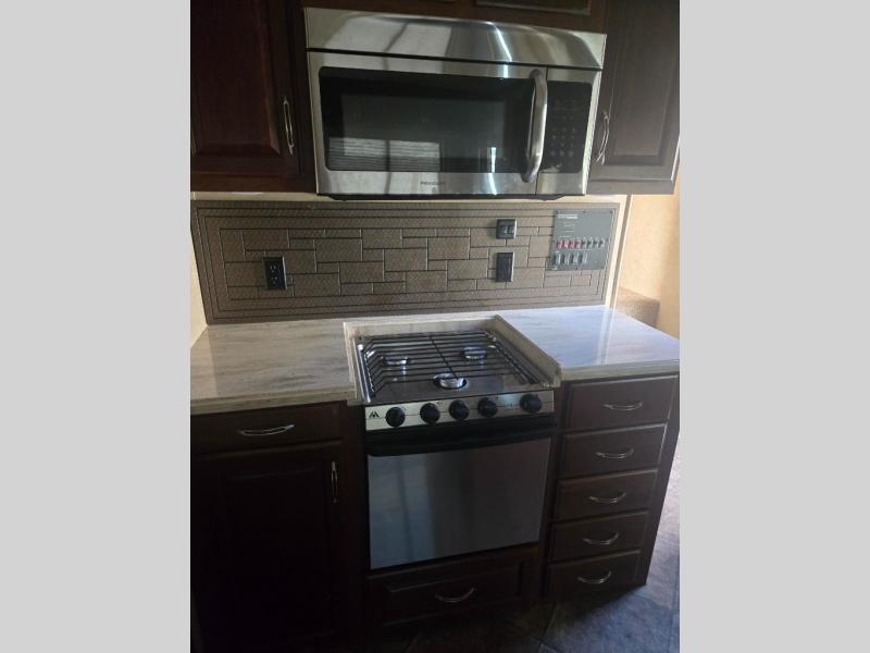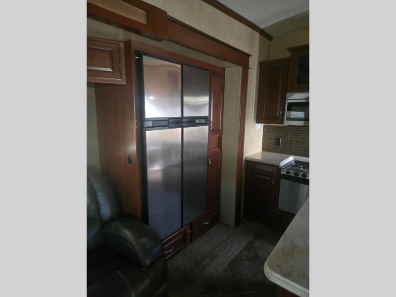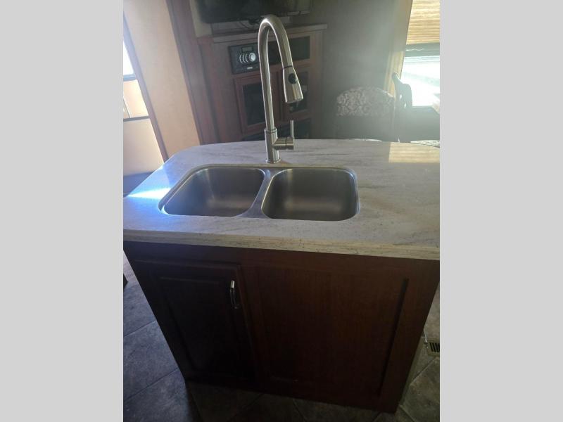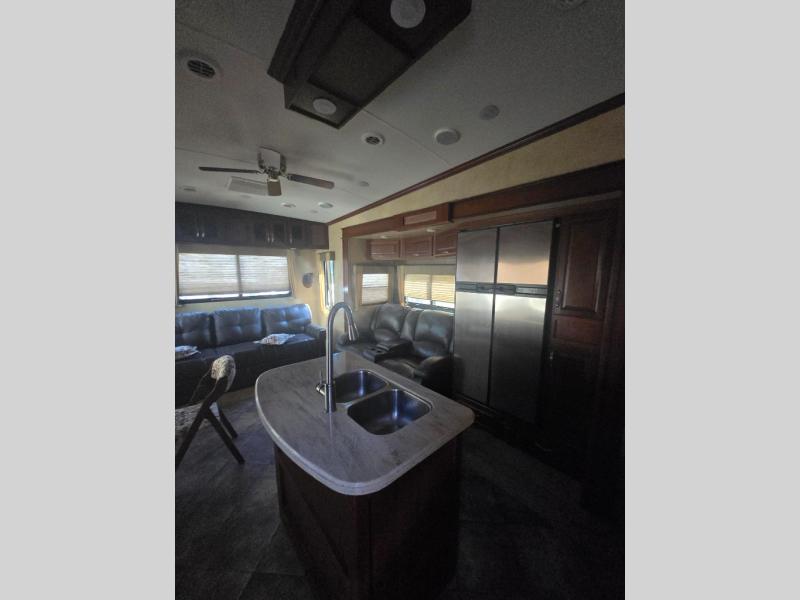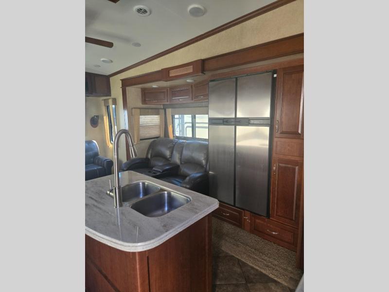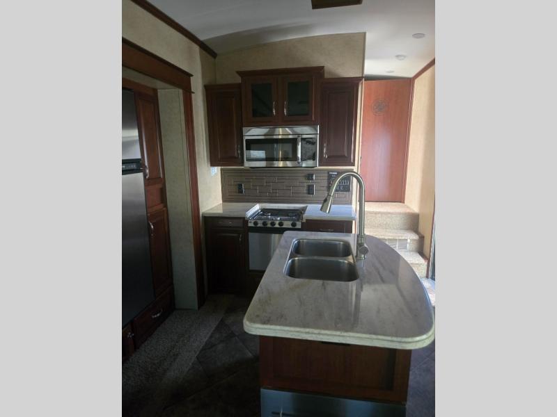 The 295RL Bay Hill fifth wheel by Evergreen offers a slide to the left of the entrance. The slide has an entertainment center with fireplace, and a free-standing table. The rear wall has a reclining sofa for you to relax on. There is also one more slide in the living/kitchen area that features theater seat, a refrigerator, and pantry. The kitchen island offers a bit more space with the kitchen sink located in the island. There is also more counter space that the stove is located on.
