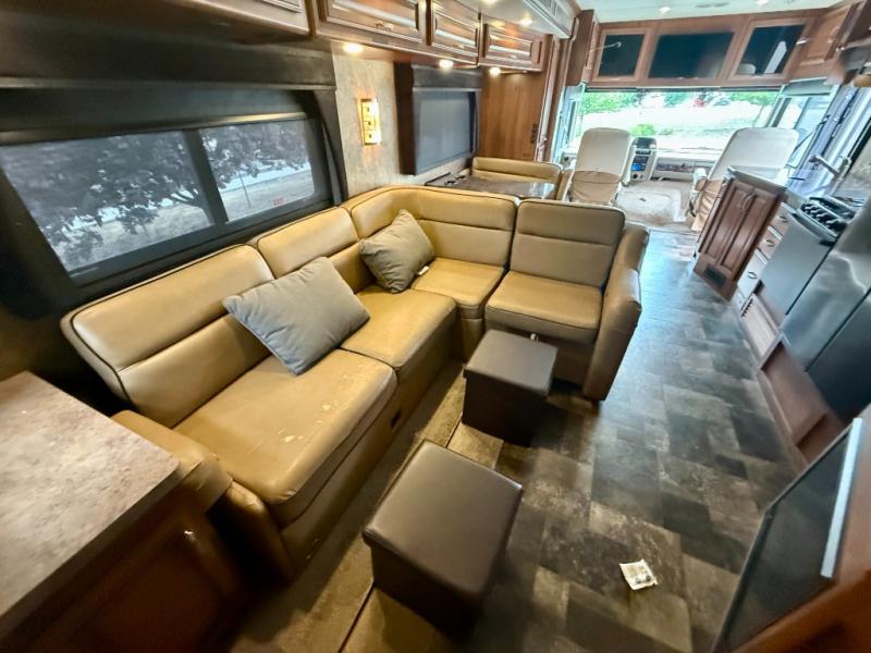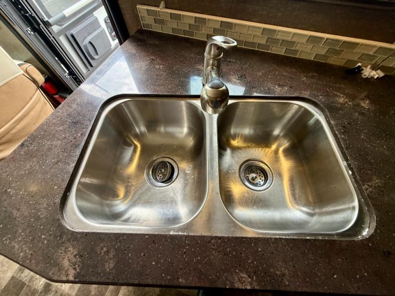 Step inside and you’re greeted by a thoughtfully designed living and kitchen area, featuring a large L-shaped sofa, dinette, and a 40" LED TV perfectly positioned for optimal viewing. The kitchen is fully equipped with a double sink, residential-style refrigerator, three-burner range, microwave, and abundant cabinet storage—everything you need to cook and dine in style.