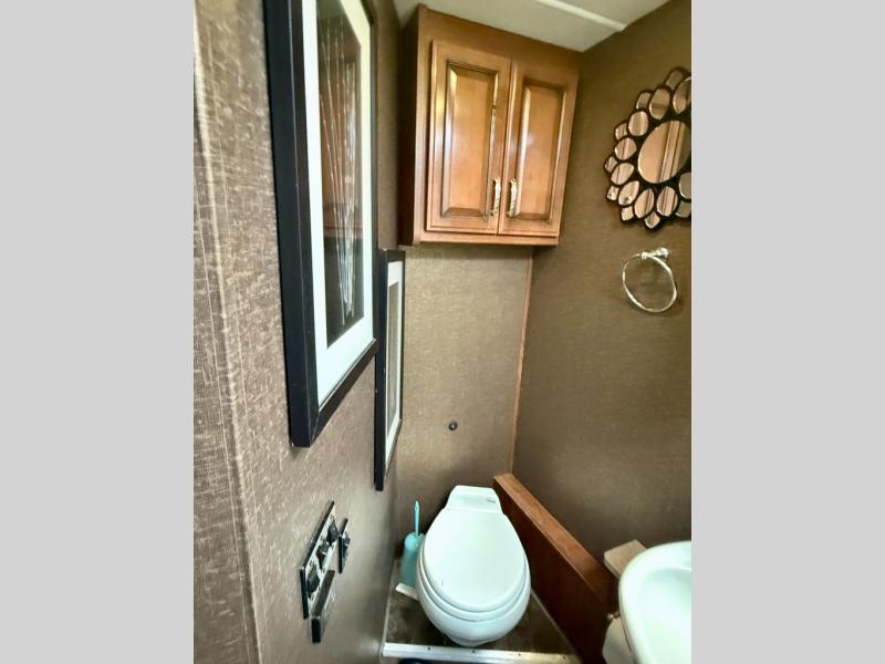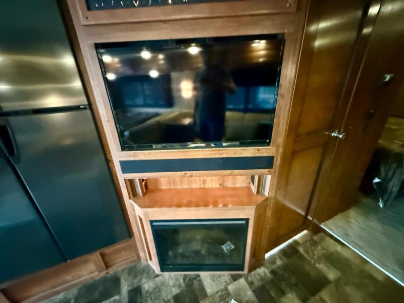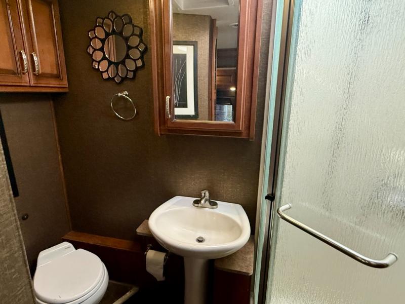 In the rear, you’ll find a private master suite with a queen bed slide, dual wardrobes, a dresser, and a 32" LED TV, creating a peaceful retreat after a long day on the road. The bathroom is conveniently located mid-coach and includes a corner shower, toilet, sink, and linen storage.