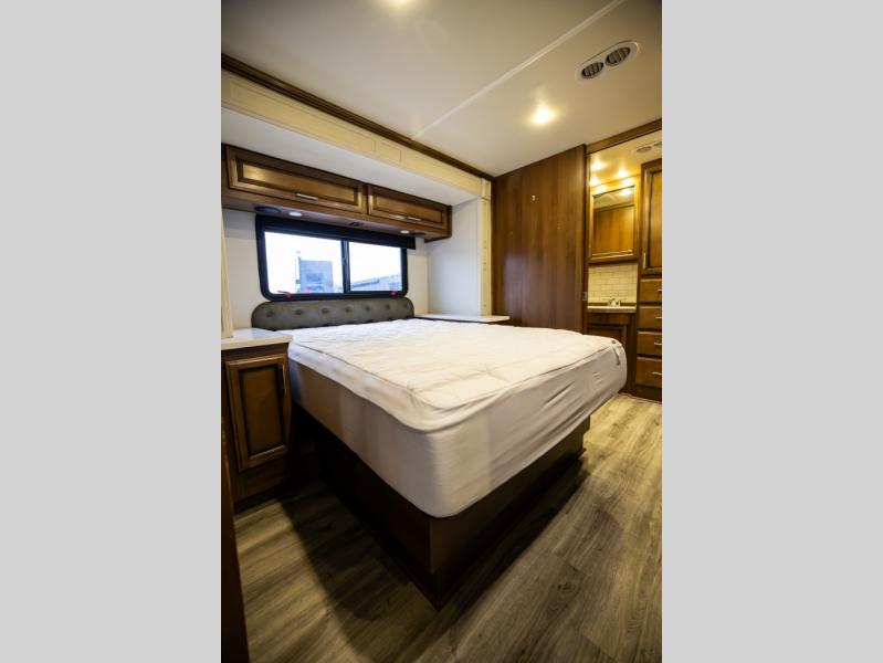 The Bounder 35K Fleetwood motor home features a rear master bathroom as well as convenient half bath. In the rear of the motor home, you will find a toilet, medicine cabinet, sink, linen cabinet, and shower. The bedroom offers a queen size bed and nightstands slide, double wardrobes, a dresser, and a 32" LED tv. As you leave the bedroom, a half bath is located to the right.