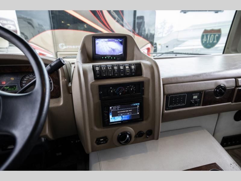 There is plenty of storage with all of the overhead cabinets in this motor home. You also have many options available to you such as, a front 32" LCD tv, exterior entertainment center, three burner range with oven, washer and dryer, fireplace, facing dinette, free-standing dinette with credenza.