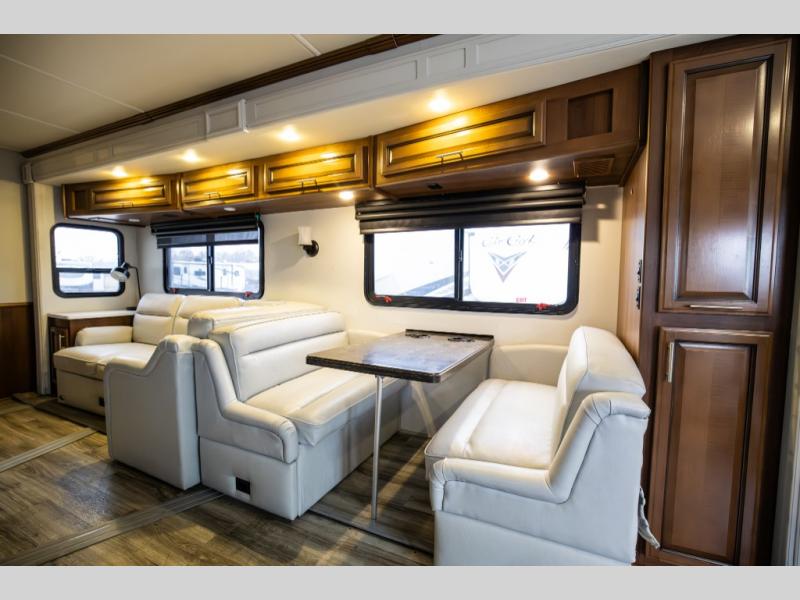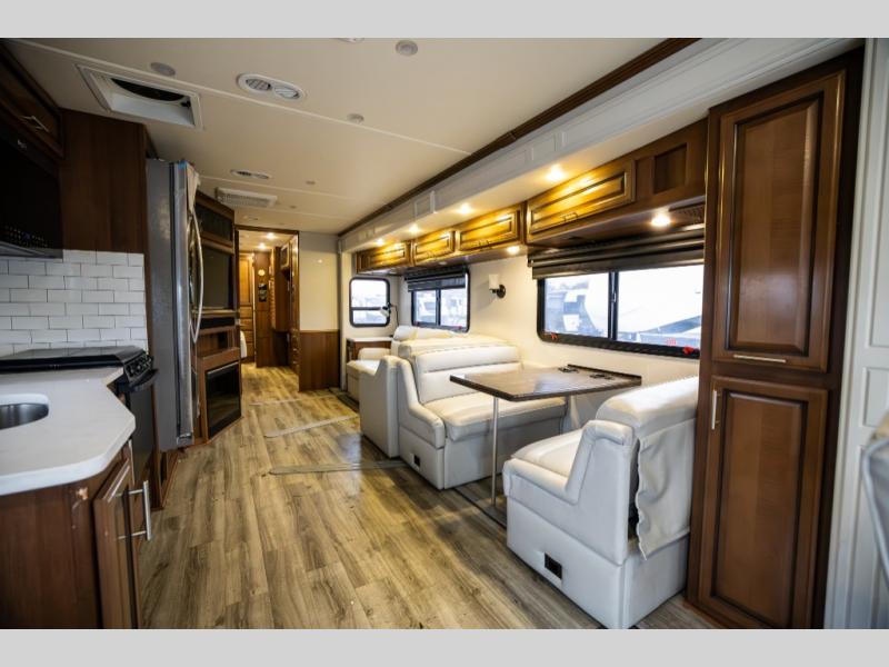 The kitchen and dining areas are combined and offer a 40" LED tv, which can easily be viewed from anywhere in the front of the motor home. One side of the motor home has a refrigerator, three burner range, microwave, and double kitchen sink. The opposite side features a slide with a pantry, dinette, l-sofa, and cabinet.
