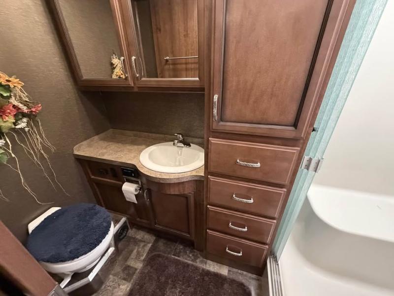 The Bounder 35K Fleetwood motor home features a rear master bathroom as well as convenient half bath. In the rear of the motor home, you will find a toilet, medicine cabinet, sink, linen cabinet, and shower. The bedroom offers a queen size bed and nightstands slide, double wardrobes, a dresser, and a 32" LED tv. As you leave the bedroom, a half bath is located to the right.