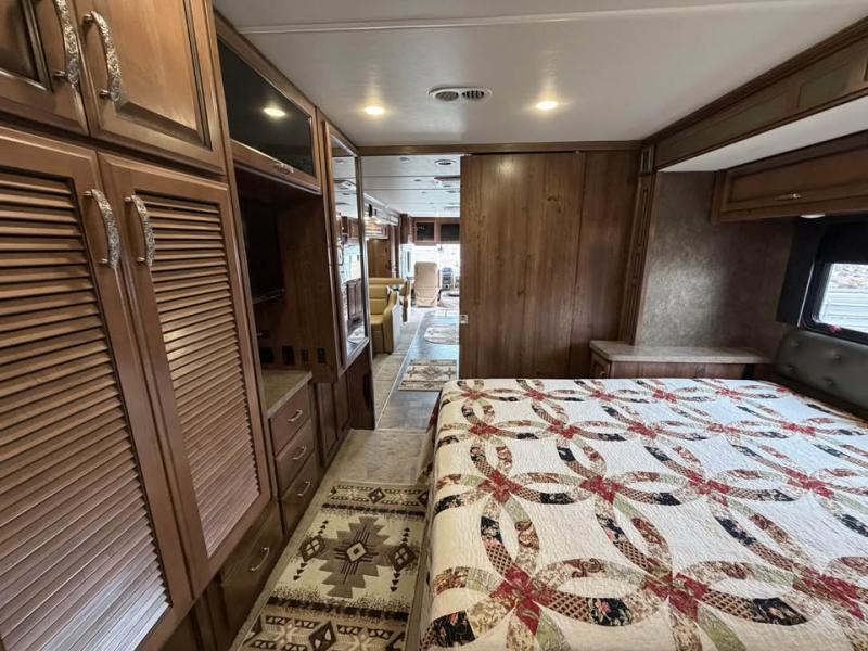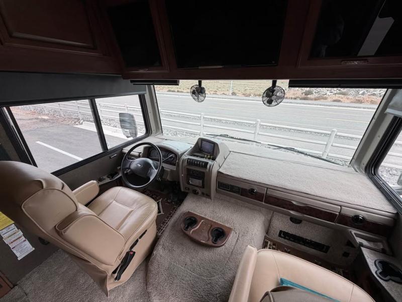 There is plenty of storage with all of the overhead cabinets in this motor home. You also have many options available to you such as, a front 32" LCD tv, exterior entertainment center, three burner range with oven, washer and dryer, fireplace, facing dinette, free-standing dinette with credenza.