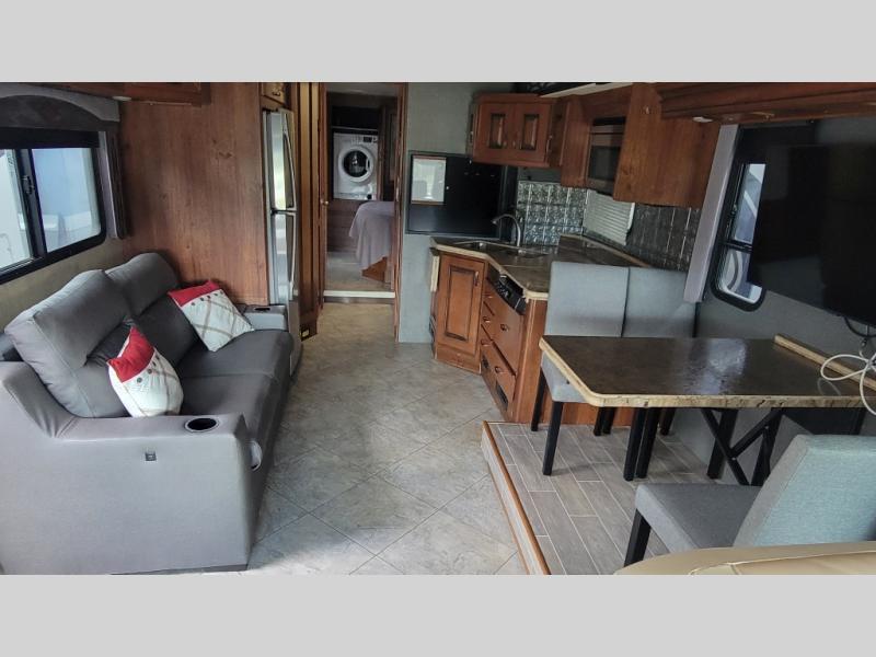 HAS WASHER/DRYER!!The Excursion 33D motor home by Fleetwood offers plenty of kitchen and living space with a slide. As you step inside this motor home to your left is a sofa sleeper with footrest and refrigerator. The opposite side has a dinette with 40" LED TV above the dinette, three burner range, microwave, and double kitchen sink slide. Continuing down the hallway the shower is on the right, and the private toilet area with a sink is on the left. The back bedroom offers plenty of space with a queen bed slide. The rear wall features a wardrobe, and there is also a bench seat with storage in the room. There are many overhead cabinets throughout this model for plenty of storage. There are also many options that you can choose to go along with the many standard features, such as a bedroom 32" LCD tv, washer and dryer, residential refrigerator, refrigerator with ice maker, driver and passenger pedestal table, hide-a-loft drop down queen bed, and a queen bed with memory foam mattress.