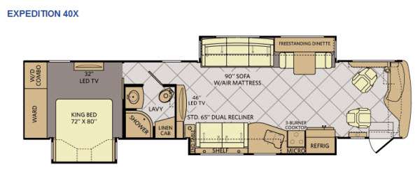 Stepping inside the 40X Expedition motor home by Fleetwood, you will be impressed with all of the space that is available. To the left of the entrance is a slide with a refrigerator, three burner range, microwave, double kitchen sink, dual recliners, and end table. The opposite side of the motor home has another slide with free-standing dinette and sofa. You can enjoy watching tv on the 46" LED tv.