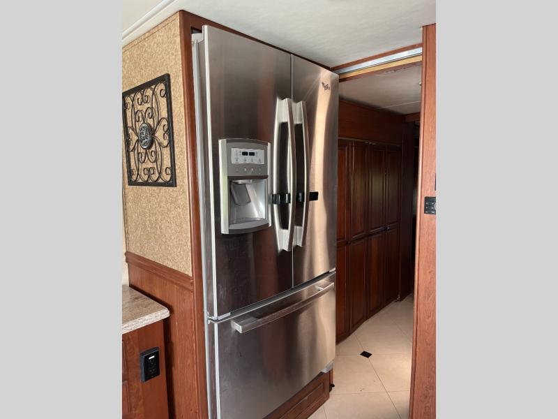 As you enter the motor home, to the left is a slide with a love seat, three burner range, microwave, and double kitchen sink. Next to the sink is a refrigerator. The other side of the motor home has a slide with a sofa and booth dinette. There is also an entertainment center with a 40" LCD TV.