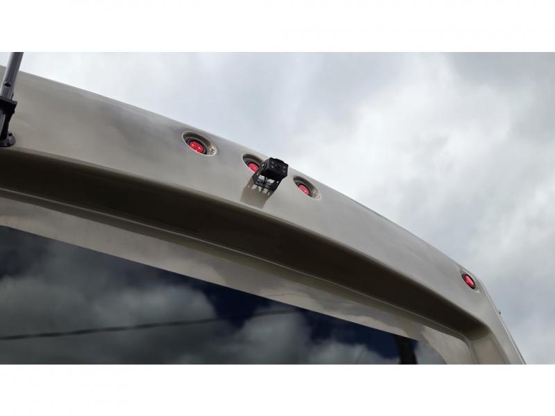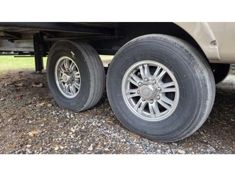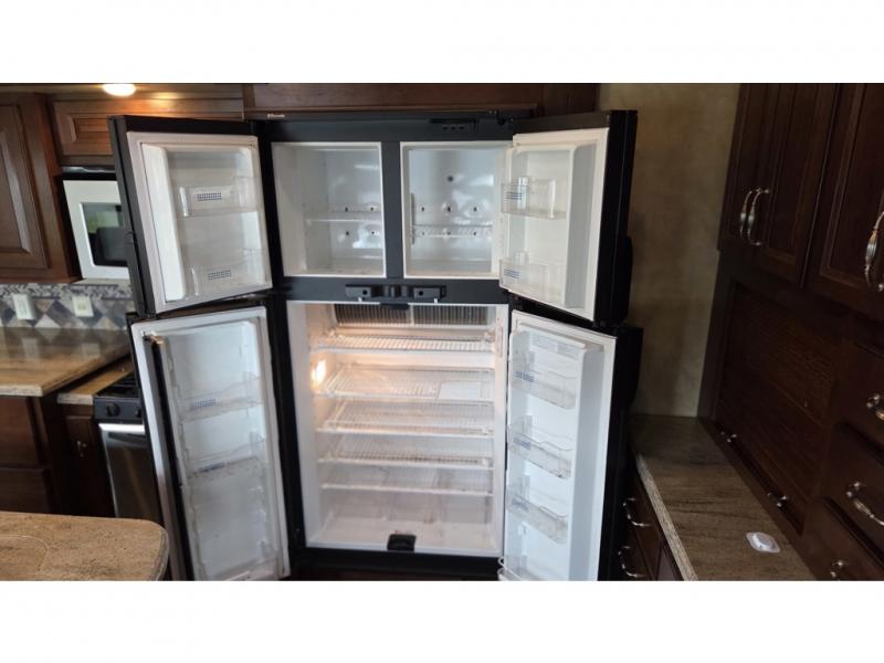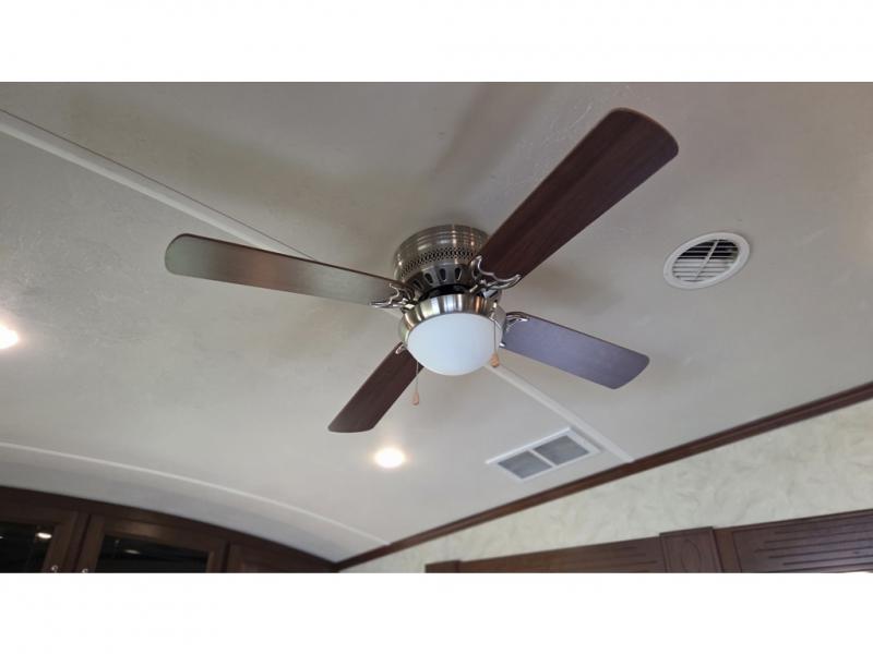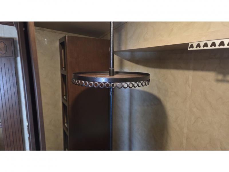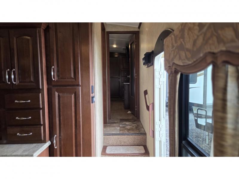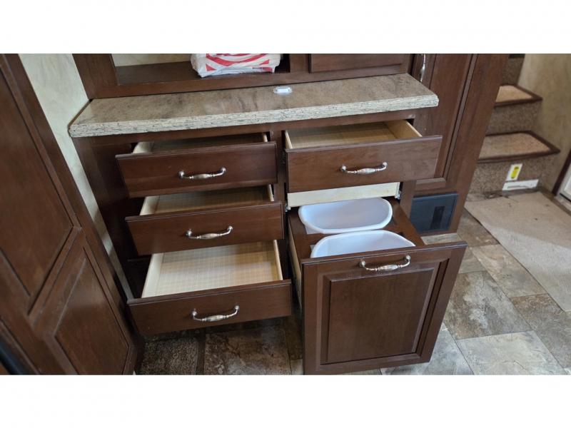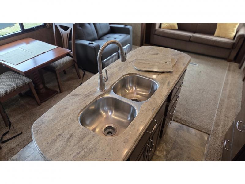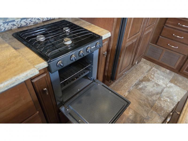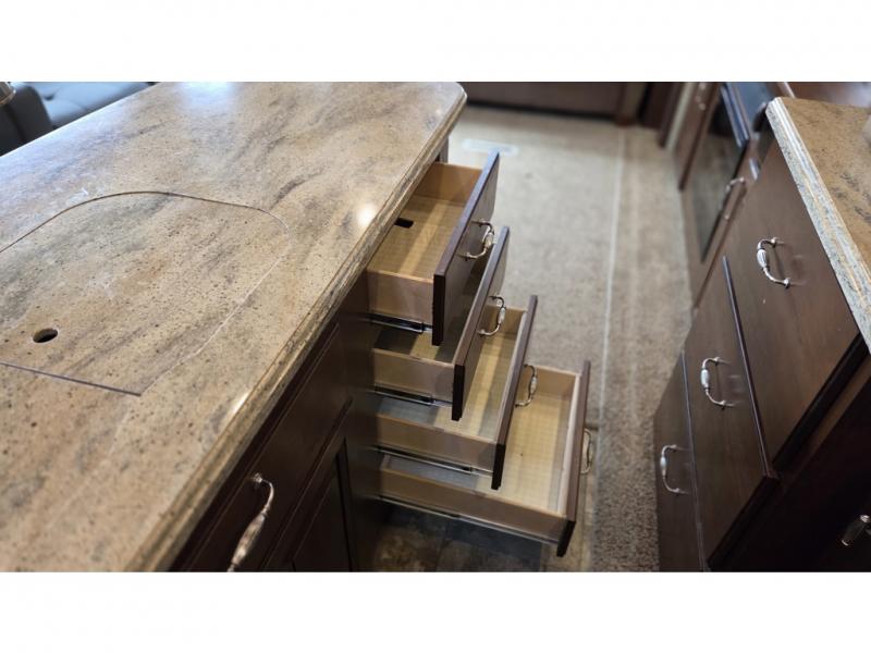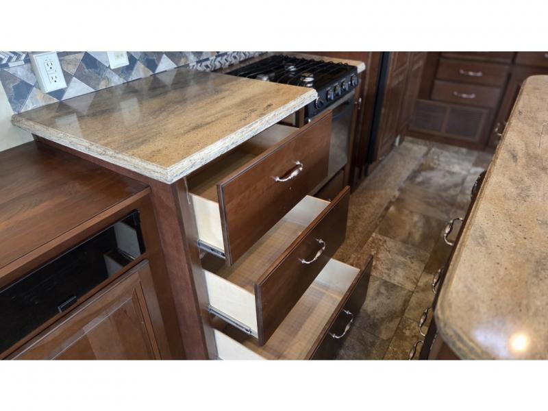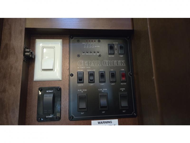 Two generous slide outs are located in the main living/kitchen area. As you enter this Cedar Creek, to the left is a slide out housing a free standing dinette with chairs, and two lounge chairs. A sofa with end table at each end and overhead cabinets runs the width of the back wall. Continuing around, another slide features a fireplace with TV lift, three burner range top, overhead microwave, pantry, refrigerator, and overhead cabinet storage. The kitchen is rounded out with a beautiful Hoosier style kitchen cabinet with appliance garage, a closet and an island with double kitchen sink. You may choose to add an optional dishwasher to the island.