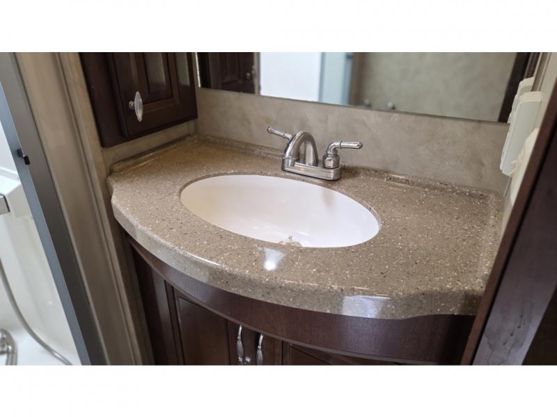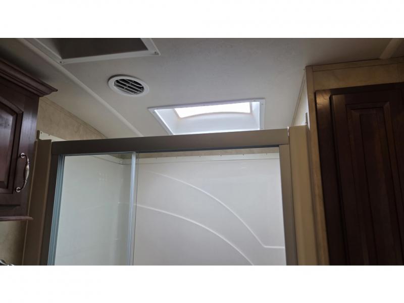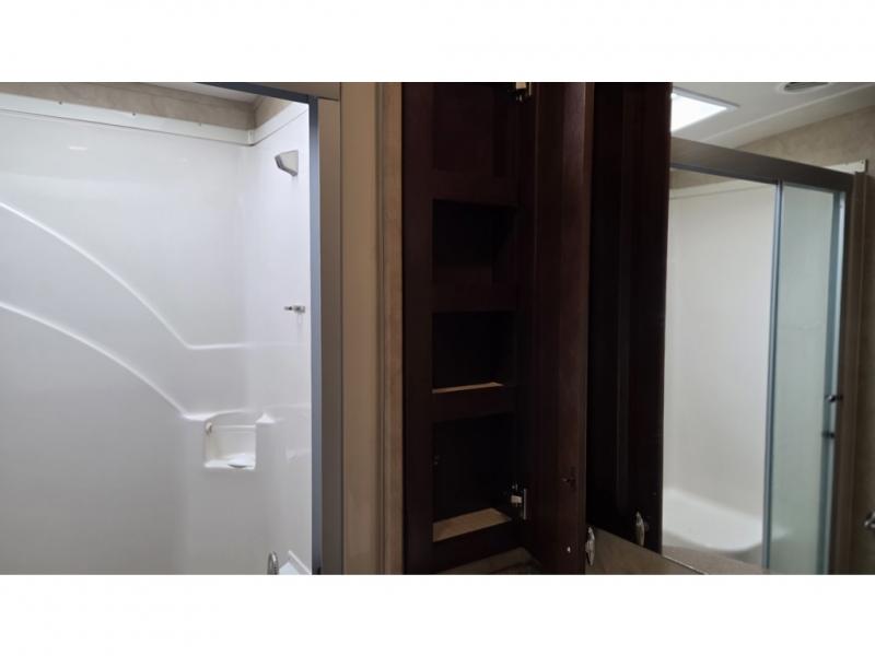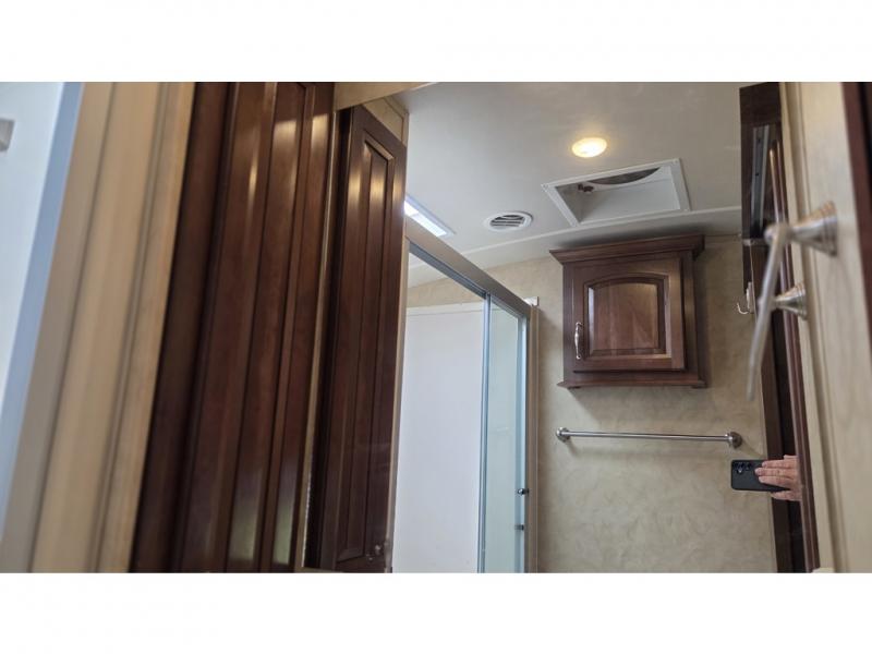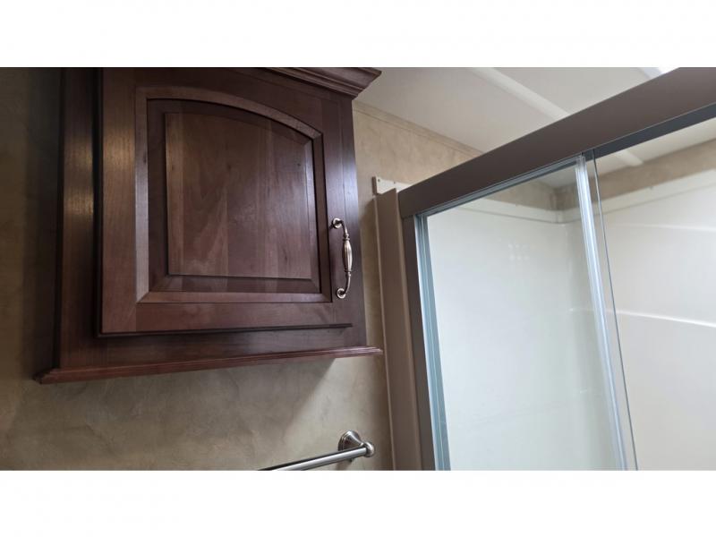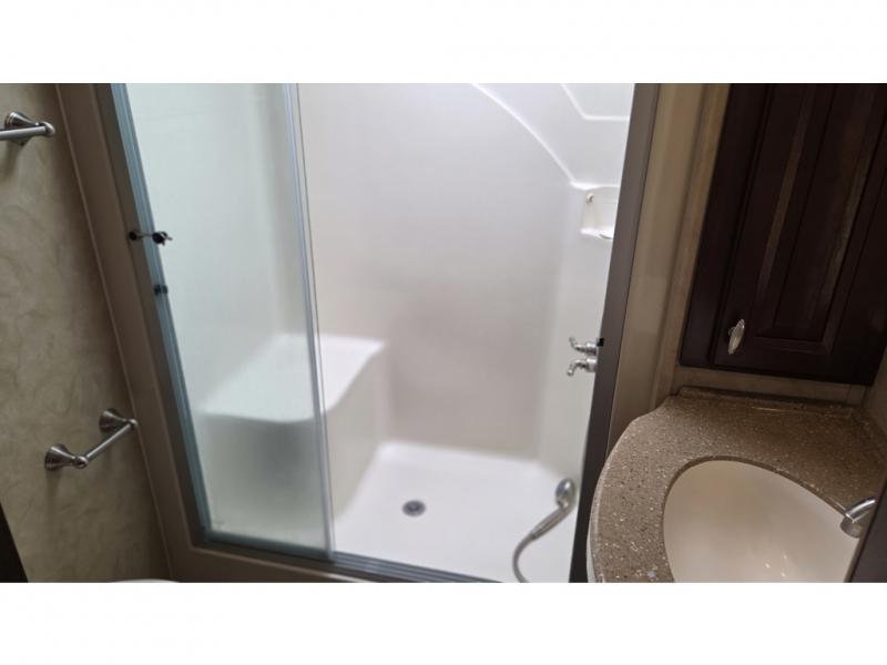 Up the steps at the front of the fifth wheel the bathroom is to your left. It includes a vanity sink, medicine cabinet, residential size shower with seat, toilet and overhead cabinet.