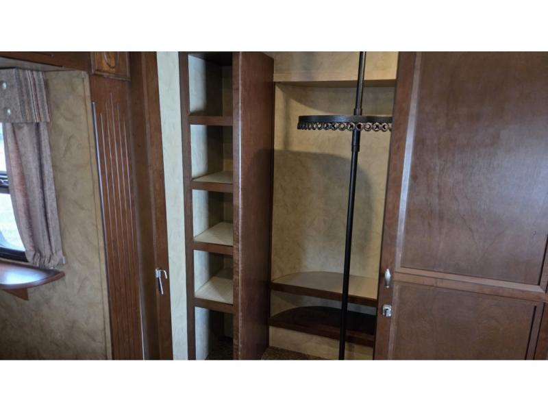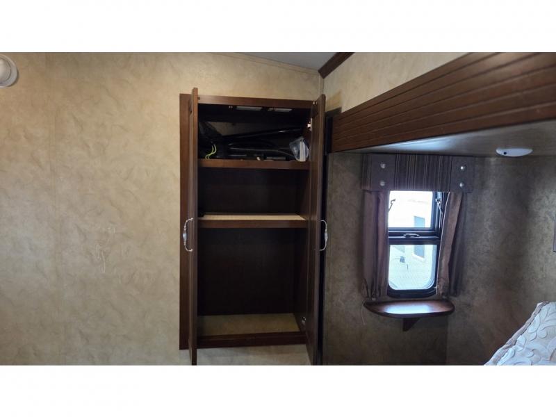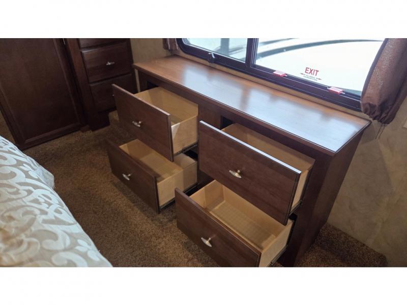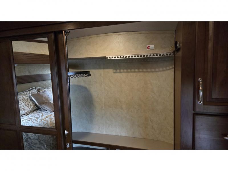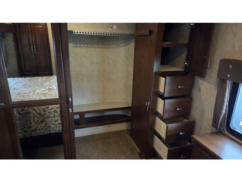 The private bedroom offers a queen bed slide out with a shelf on either side. There is also a linen area with hamper, dresser and full width wardrobe with shelves and drawers for all of your storage needs.