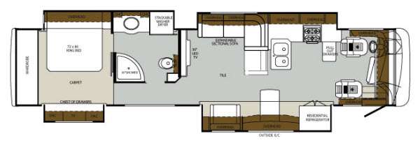 As you enter the motor home, on the left side there is a slide with a refrigerator, table, and lounge chair. The opposite slide offers a set of pullout drawers, three burner range, double kitchen sink, and an extendable sectional sofa slide. Along the rear wall there is a 32" LED TV for you to enjoy.