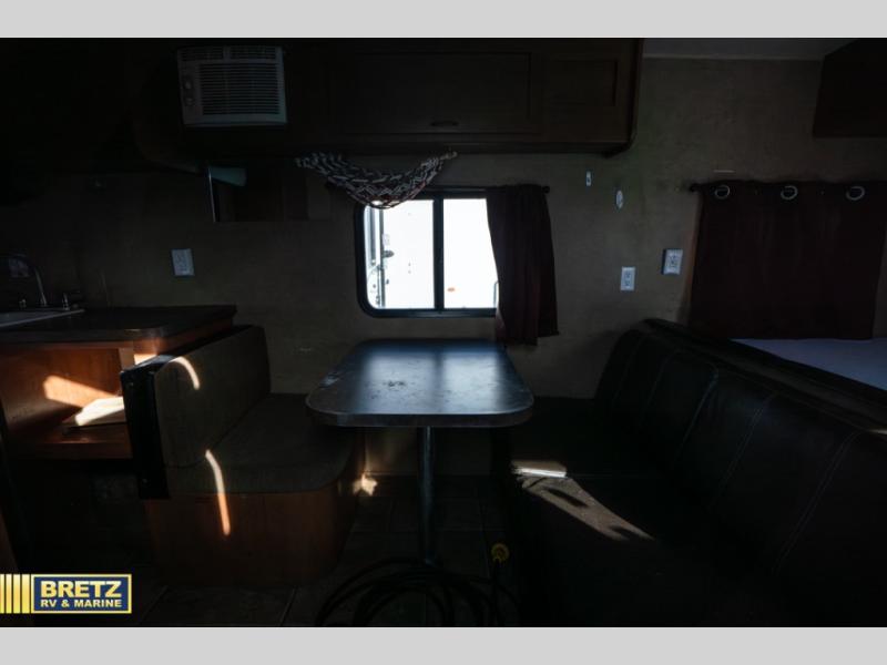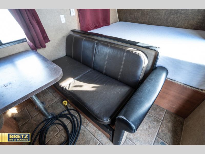 Directly across from the entry door is a dinette with jack knife sofa. A front queen size bed has overhead cabinets located along the front wall of the Wolf Pup 22BP.