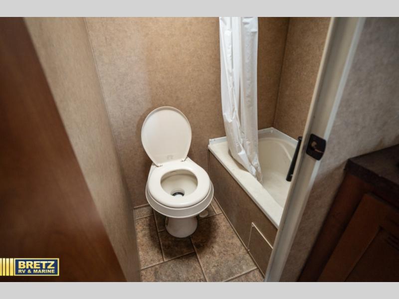 The Cherokee Wolf Pup 22BP travel trailer boasts a rear bunkhouse as well as a rear bathroom.