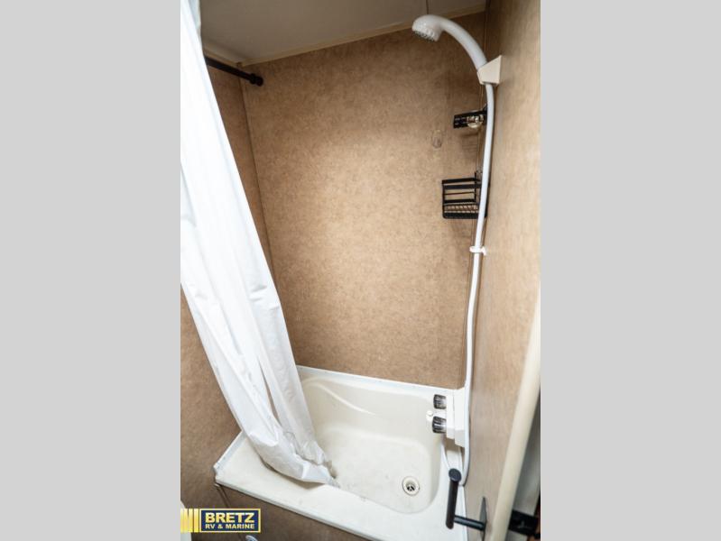 Two bunk beds are located in the rear left of the travel trailer. A bathroom including a toilet and tub/shower combination is in the right rear. Continuing around you will find a two burner range, single galley sink, countertops and overhead cabinets. A pantry and a refrigerator/entertainment center are housed on the opposite wall.