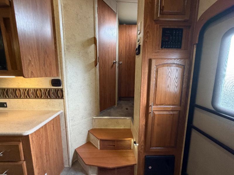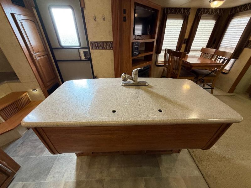 As you enter the fifth wheel, to the left there is a slide with a corner entertainment center, an optional fireplace below the entertainment center and a free-standing dinette. Along the rear wall you will find two chairs and three end tables. The other slide has a hide-a-bed sofa, refrigerator, and three burner range. You will also find a large pantry and microwave. The kitchen island provides extra counter space as well as a large sink.
