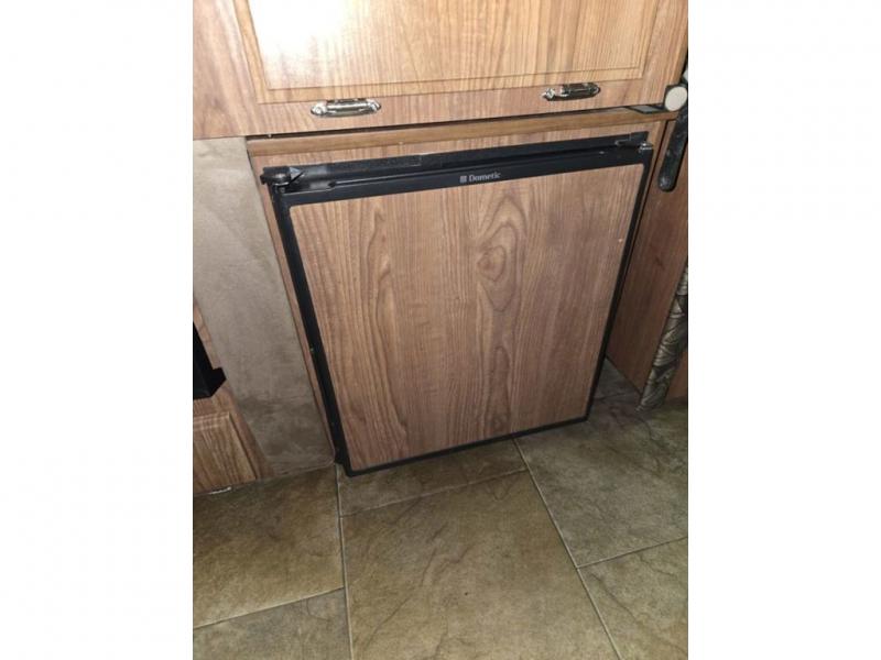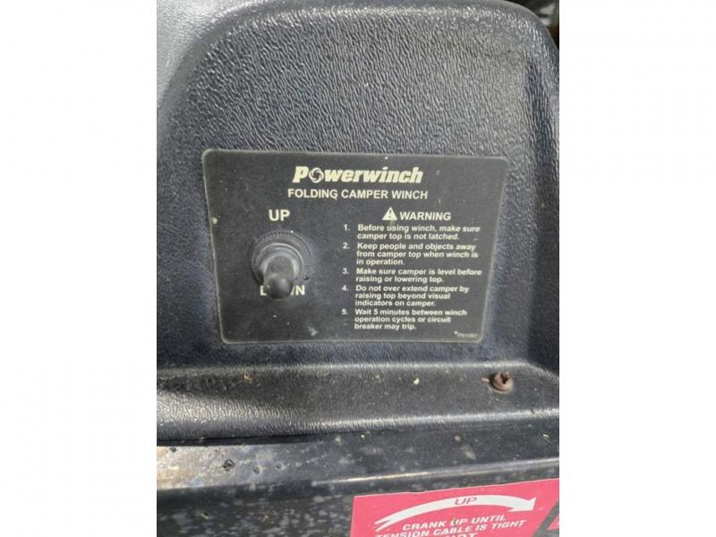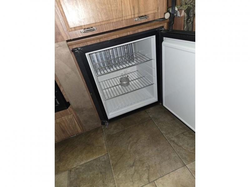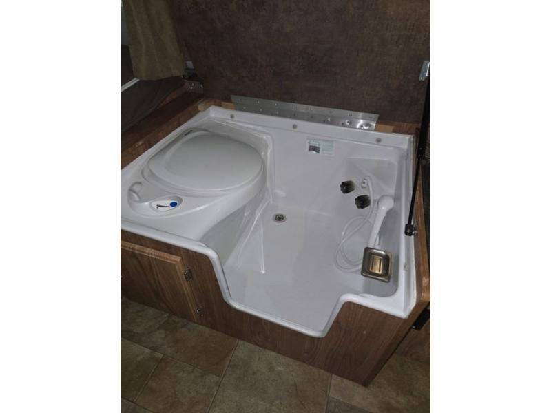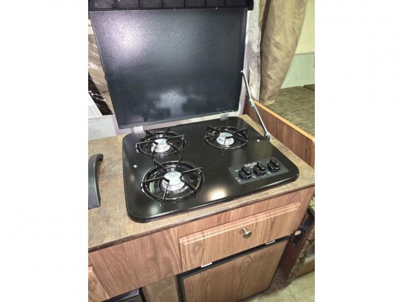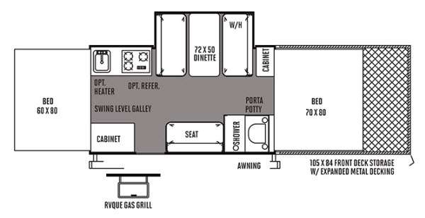 As you enter the camper, to the left there is a cabinet. To the right of the entrance you will find a seat, shower, and port-a-potty. The opposite offers a cabinet, dinette slide, three burner range, sink, optional refrigerator, and optional heater.