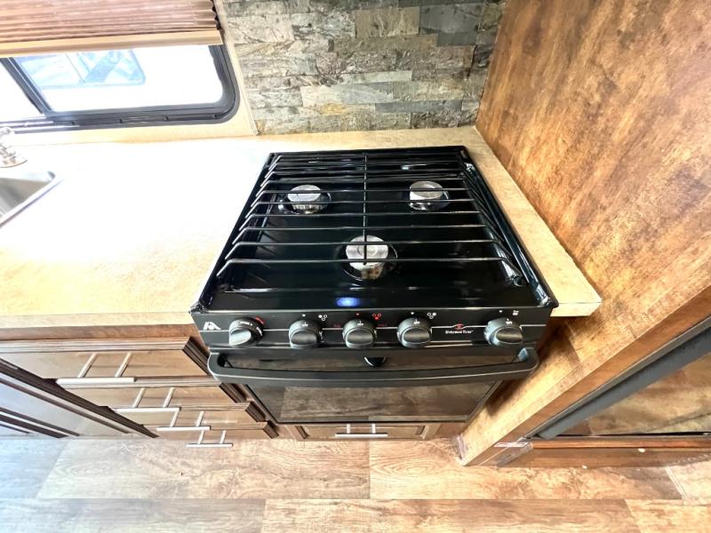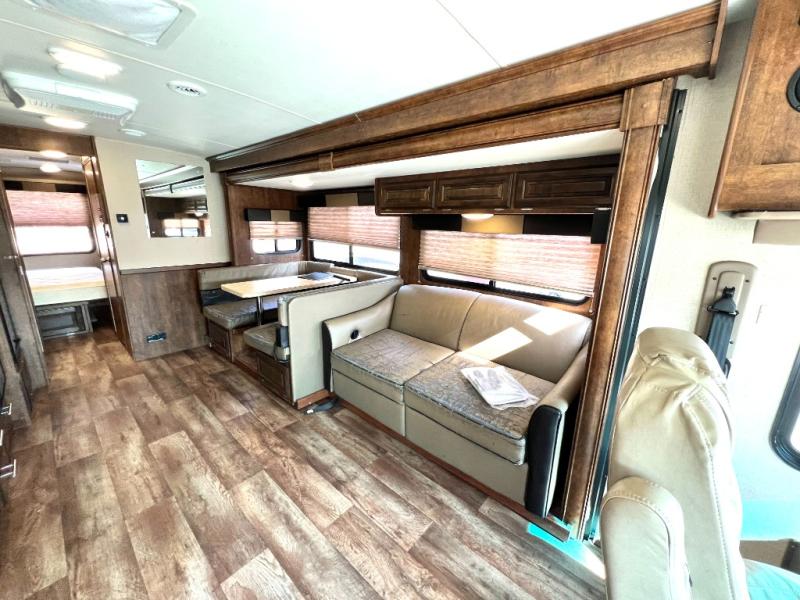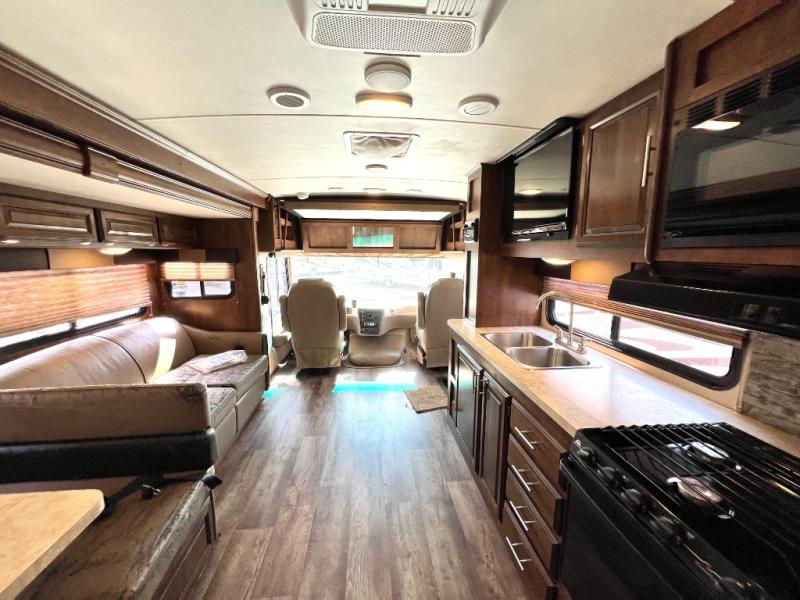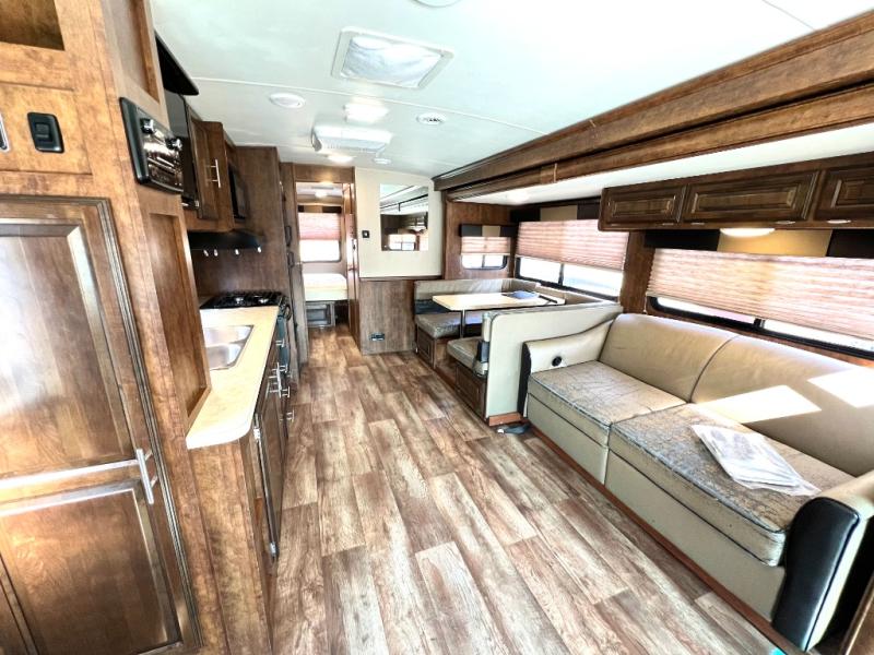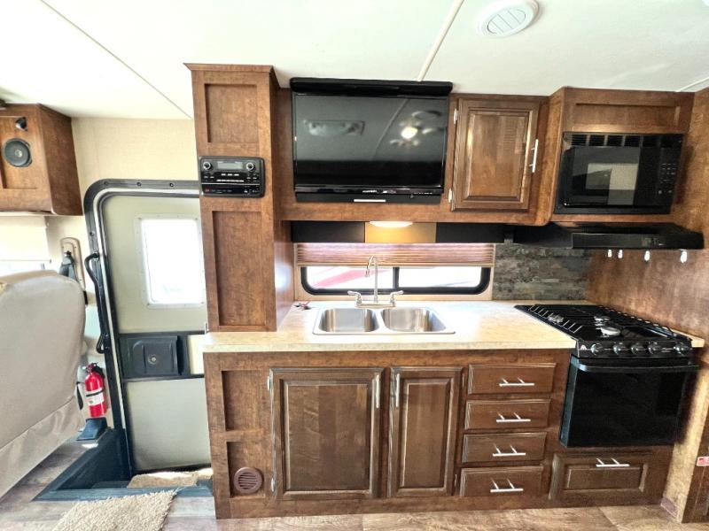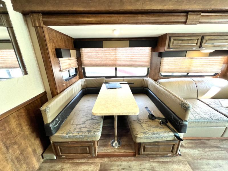 As you enter the motor home, on the left is a double kitchen sink, 32" LED TV, three burner range, microwave, and refrigerator. The other side of the motor home offers a slide with a hide-a-bed sofa with footrests and a wrap-around booth dinette.