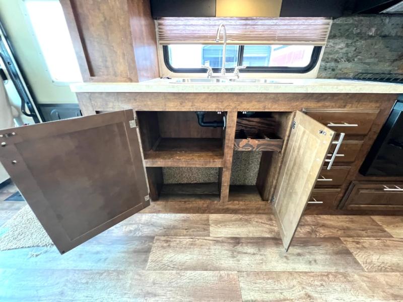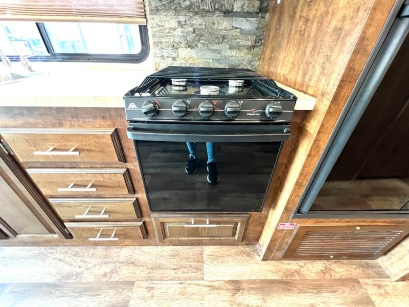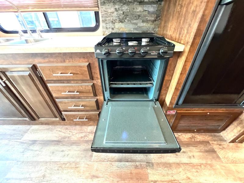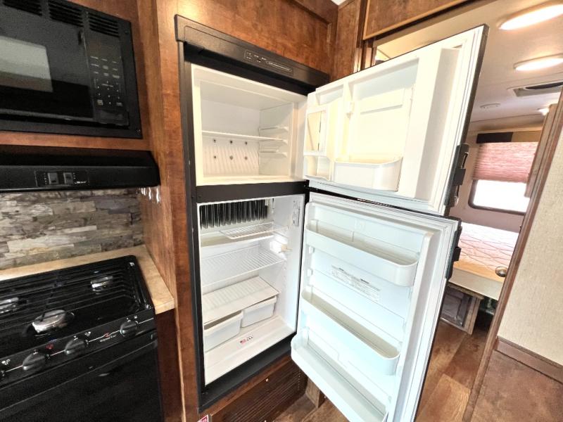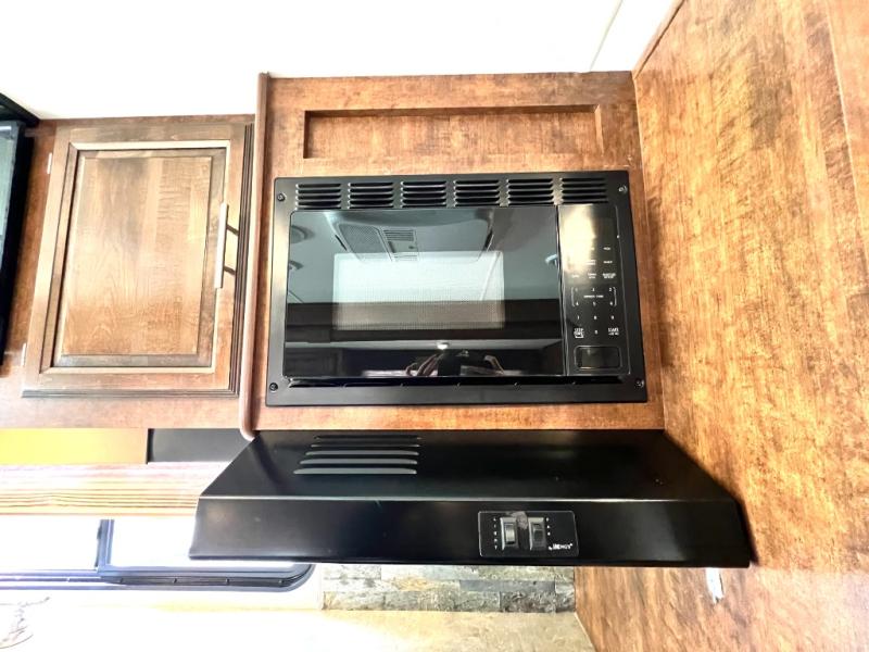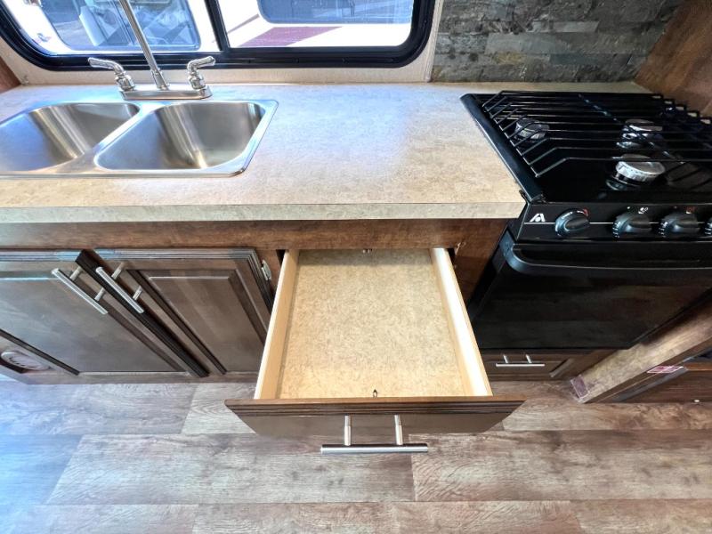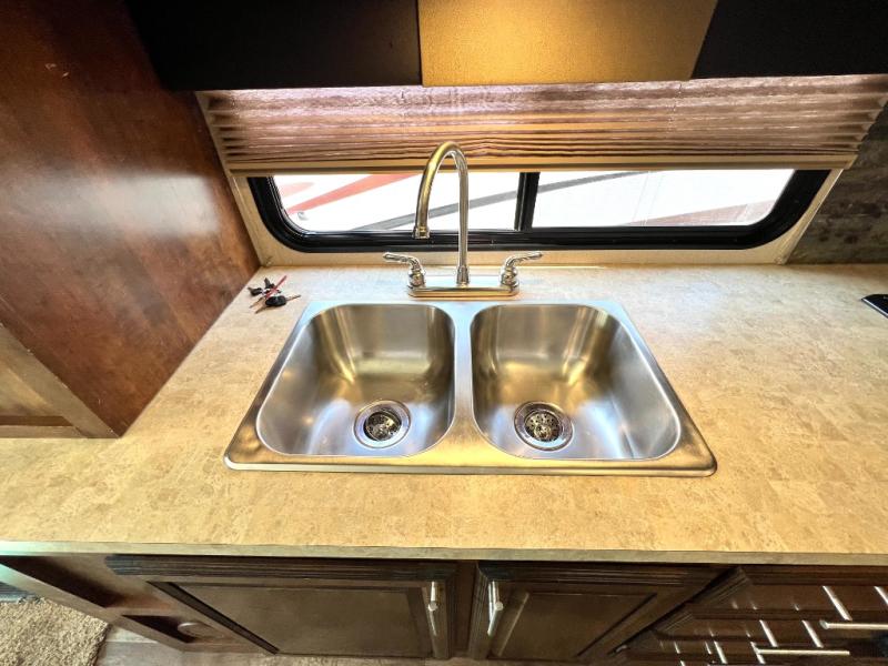 As you enter the motor home, on the left is a double kitchen sink, 32" LED TV, three burner range, microwave, and refrigerator. The other side of the motor home offers a slide with a hide-a-bed sofa with footrests and a wrap-around booth dinette.