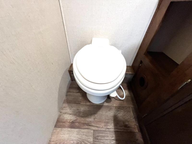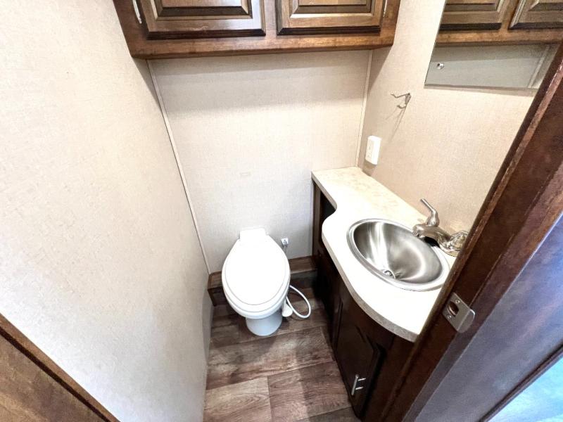The bathroom has a private toilet area with a sink on one side of the motor home and a shower on the other side.