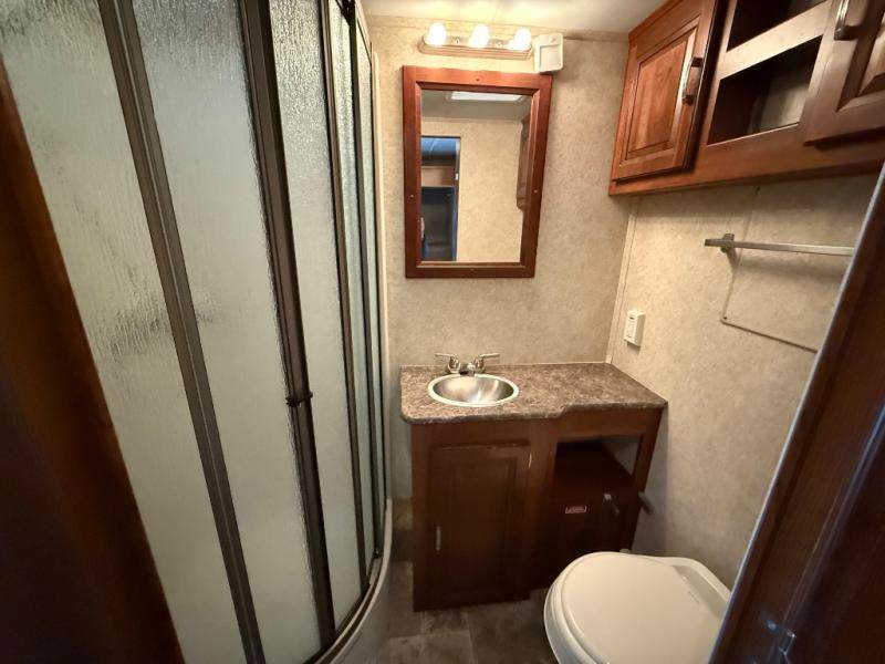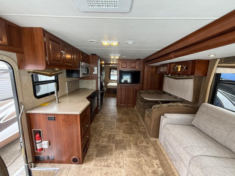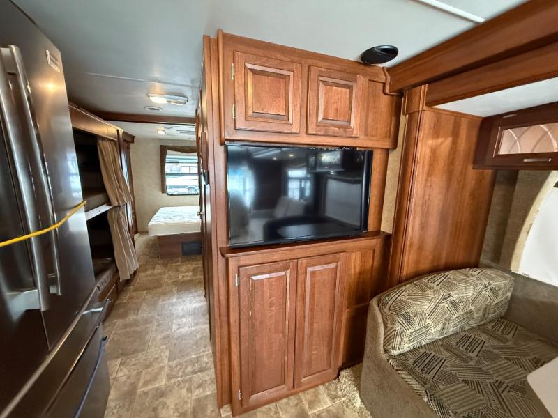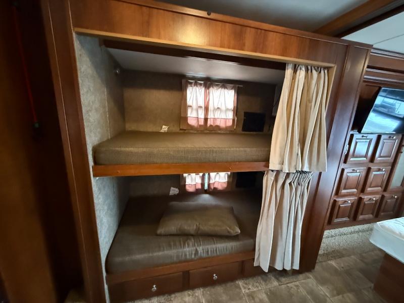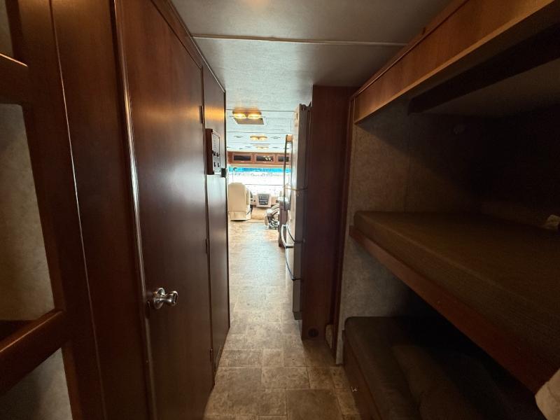 The Georgetown 351DSF motor home by Forest River is unique in the fact that it offers bunk beds. The rear bedroom has a queen bed and wardrobe. On the opposite side, you will find a tv, wardrobe, and bunk bed slide.