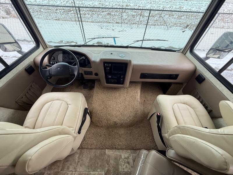Proceeding to the front of the motor home, the kitchen offers a pantry, refrigerator, three burner range, microwave, and double kitchen sink. To the right of the entry door there is a barrel chair for your comfort. Along the opposite side there is a hide-a-bed and dinette slide. The tv is located in a nice spot so you can see it from anywhere in the kitchen and living areas.