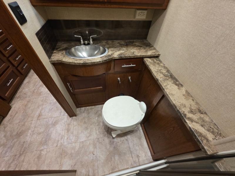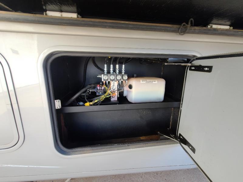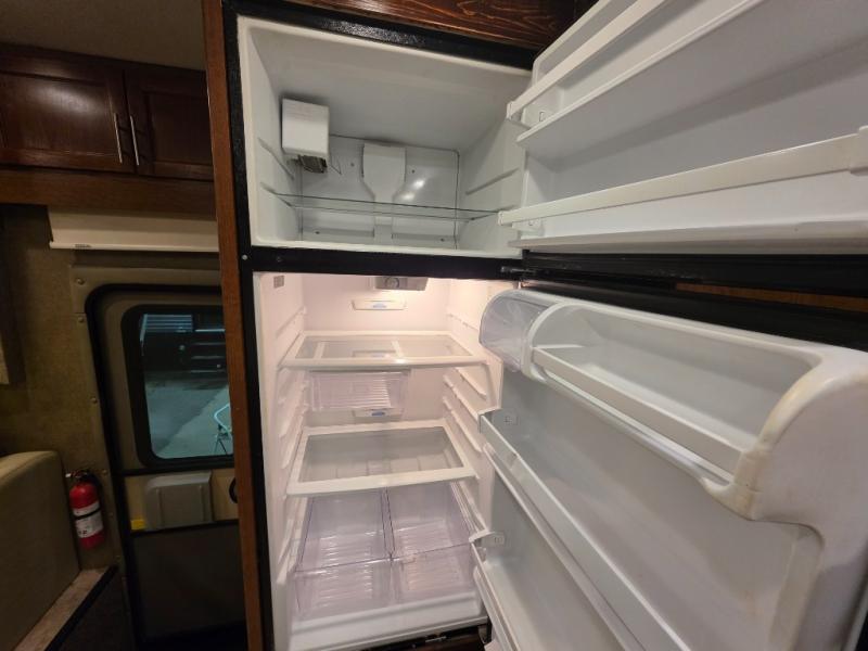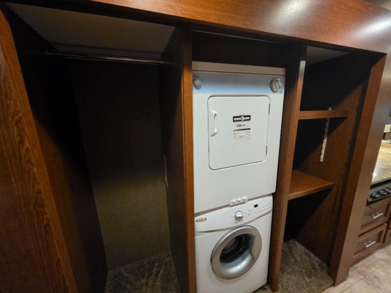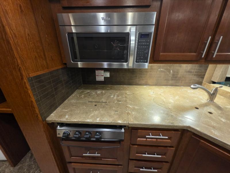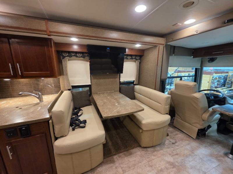 The living area and kitchen are located in the front of the motor home. There is a refrigerator, and sofa on one side of the motor home. The other side offers a slide with a booth dinette and 32" LED TV above the dinette, large sink, three burner range, microwave, pantry with adjustable shelves, washer and dryer prep, and two closets.