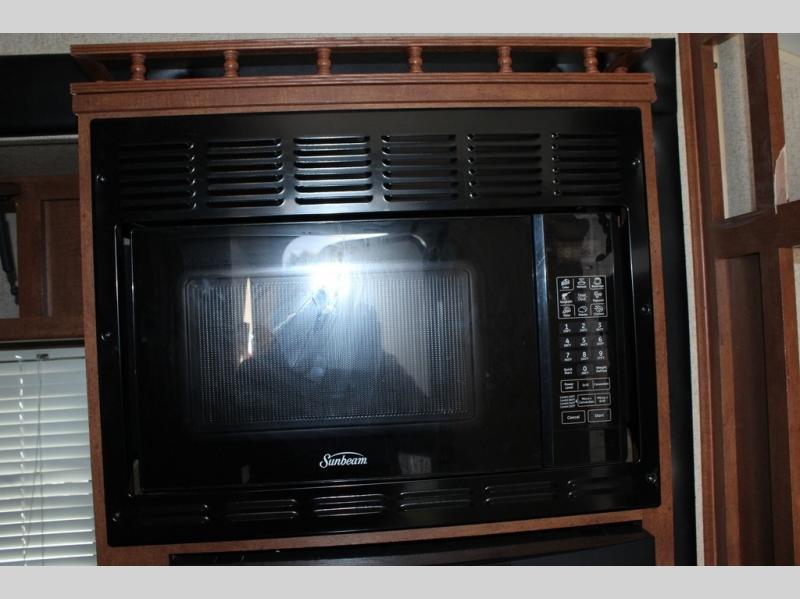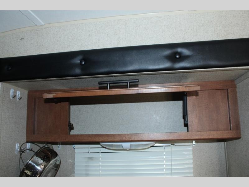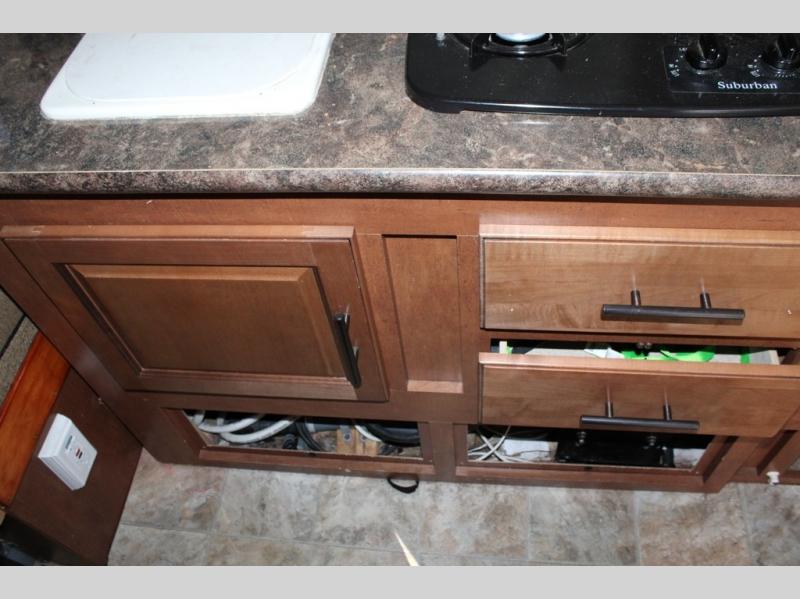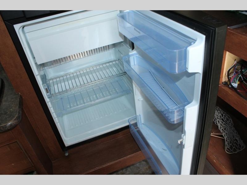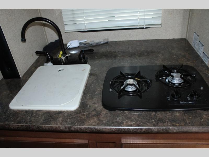 The slide has a single sink, two burner range, and refrigerator. Next to the slide is an entertainment center.
