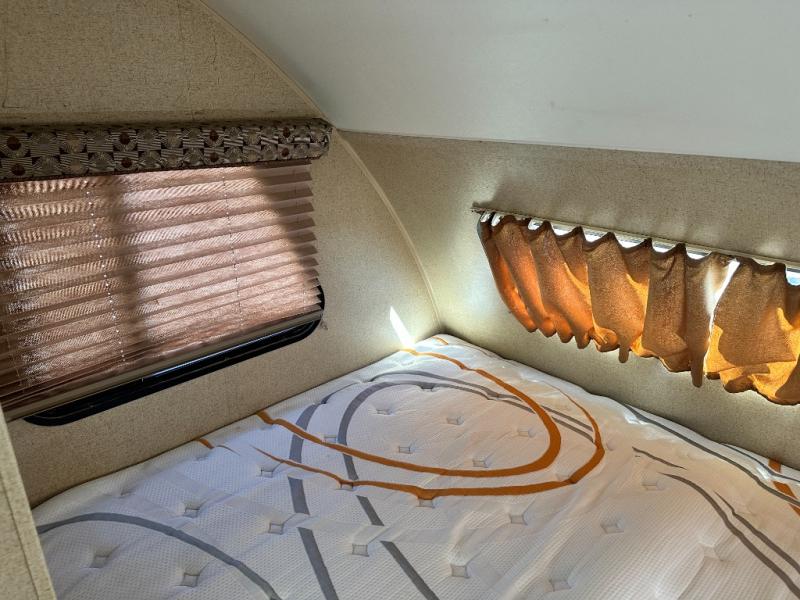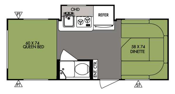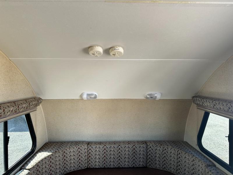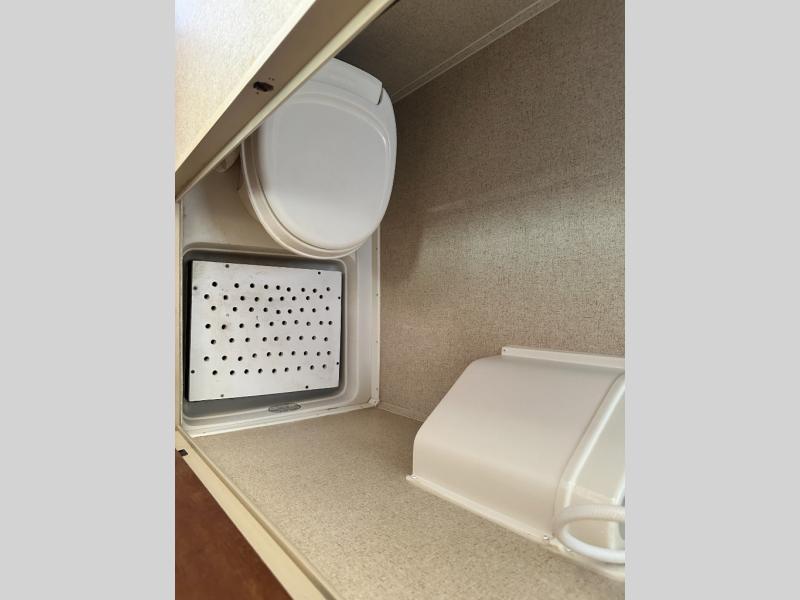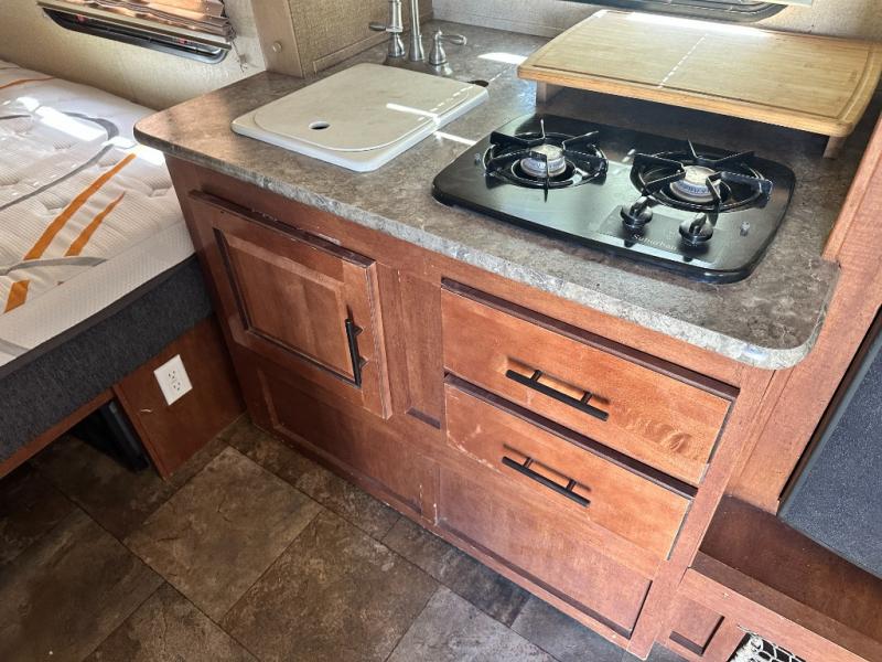The slide has a sink, two burner range and refrigerator. In the front, you will find a u-dinette.