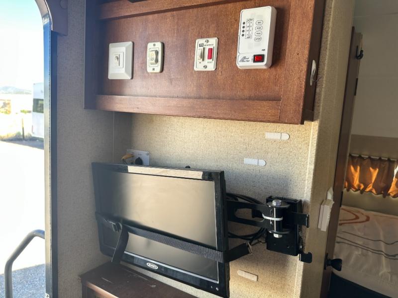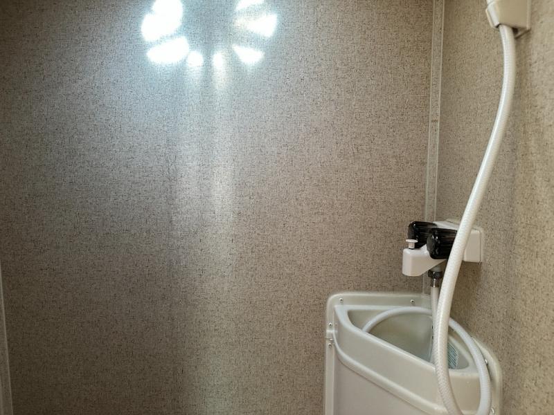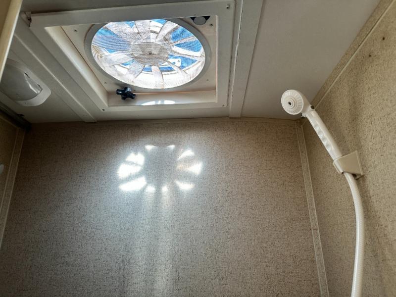 As you enter the travel trailer, to the left there is an entertainment center. The bathroom has a toilet, and a shower.