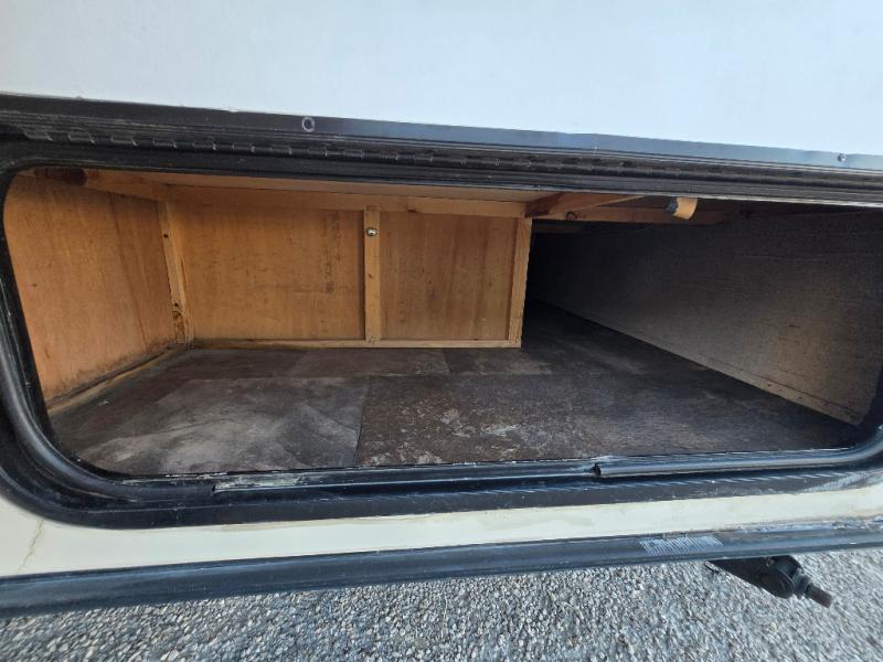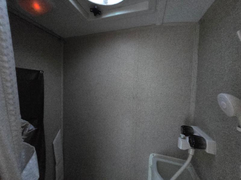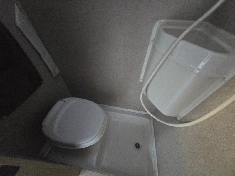As you enter the travel trailer, to the left there is an entertainment center. The bathroom has a toilet, and a shower.