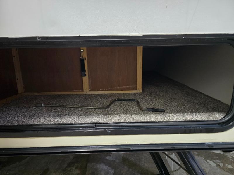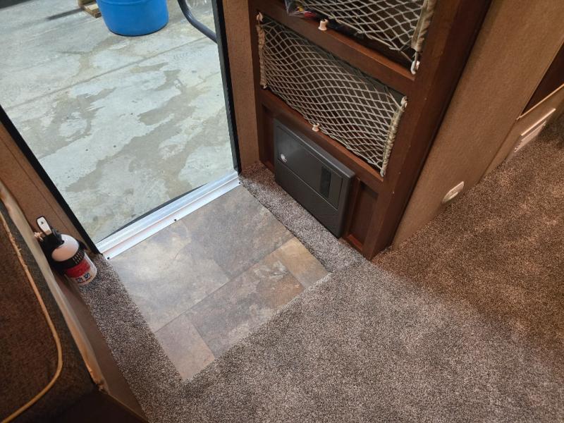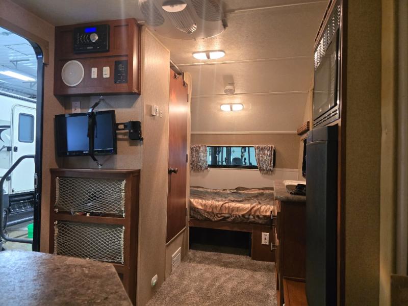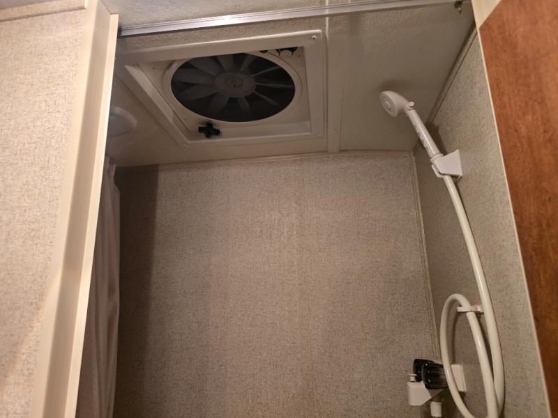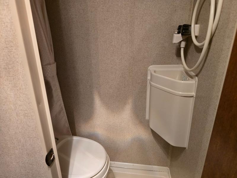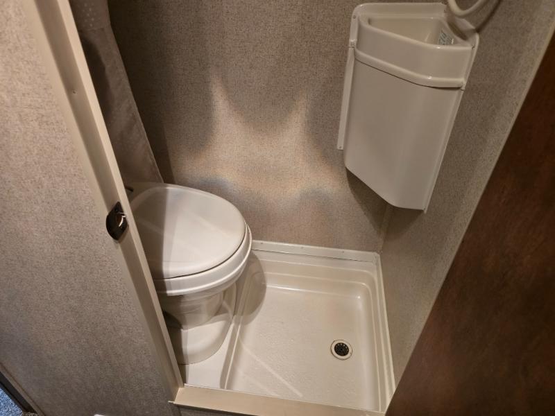 As you enter the travel trailer, to the left there is an entertainment center. The bathroom has a toilet, and a shower.