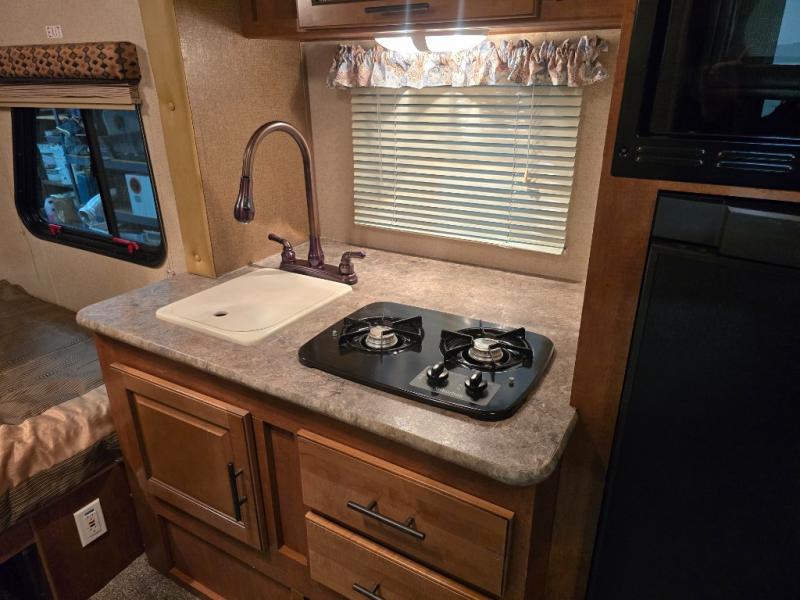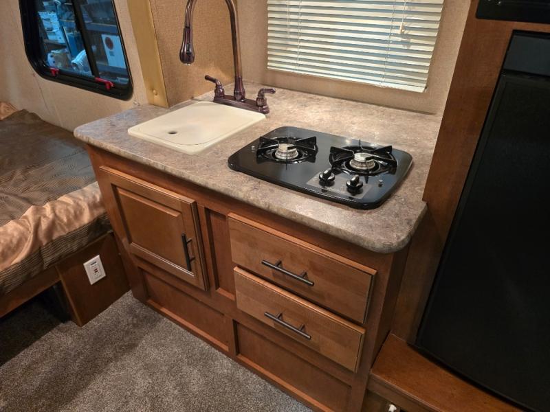 The slide has a sink, two burner range and refrigerator. In the front, you will find a u-dinette.