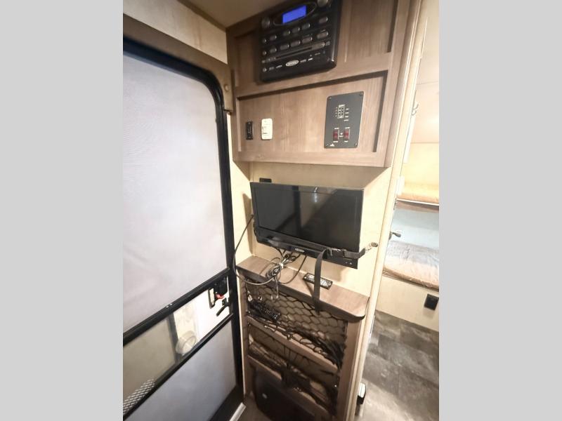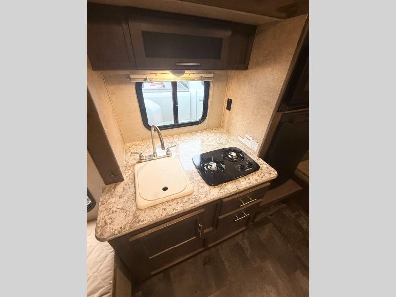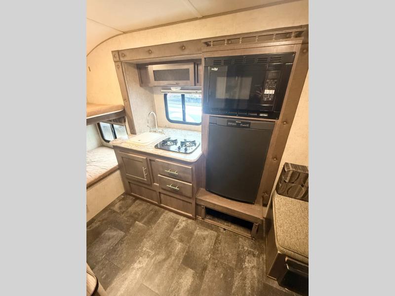To the right of the entrance you will find a front u-dinette. The slide has a refrigerator, two burner range, and sink.