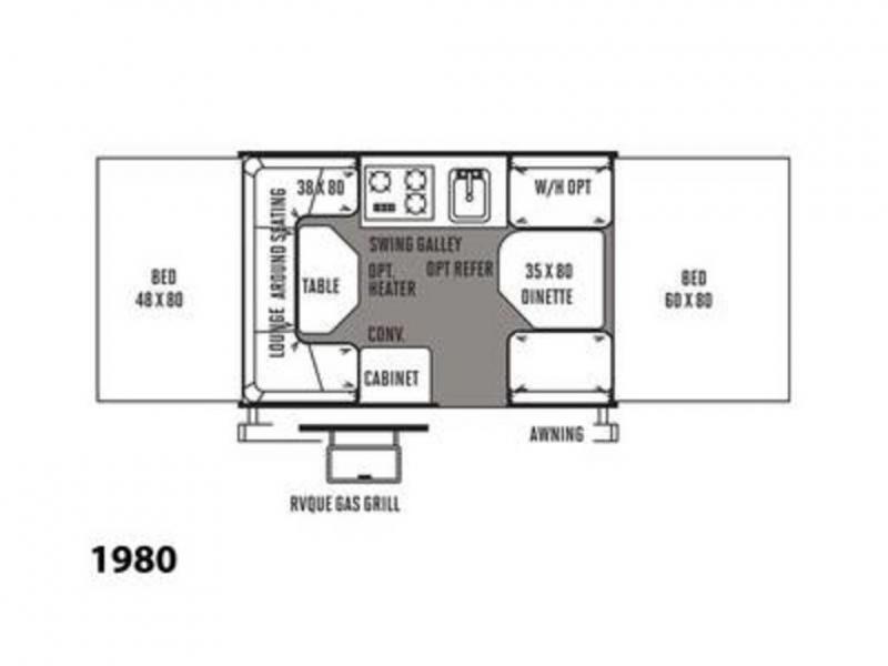 Front and rear tent end beds also offer comfy sleeping in addition to the 35 x 80 booth dinette and the 38 x 80 lounge around seating. An optional water heater could be included under a booth seat.