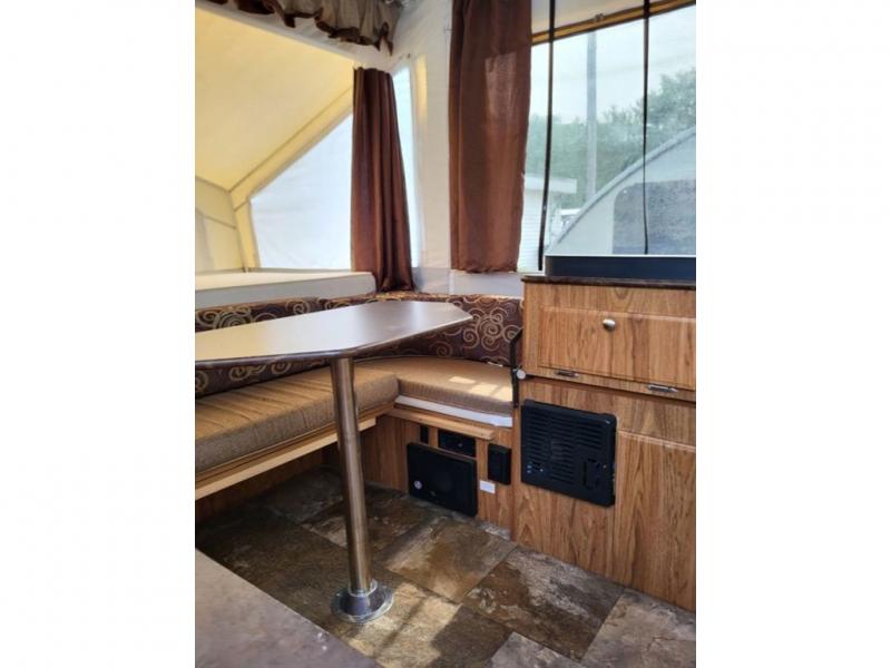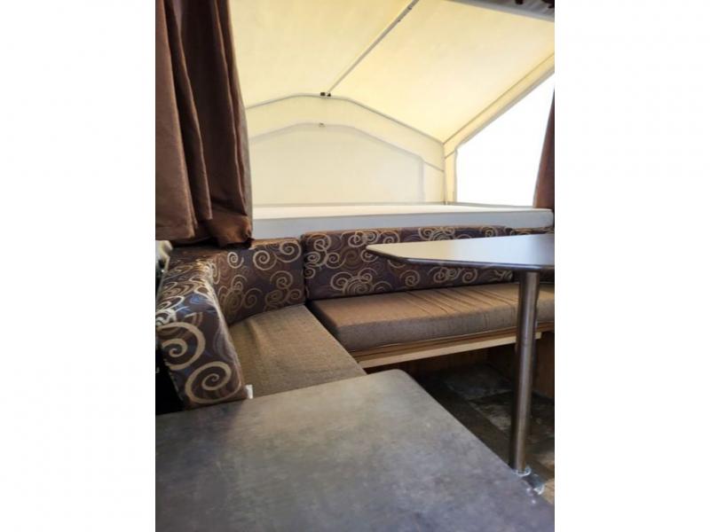 Plenty of space for late night games is included inside the Rockwood Freedom 1980 folding pop-up camper. A front booth dinette and rear lounge around seating with a table allow lots of space for eating, playing or sleeping.