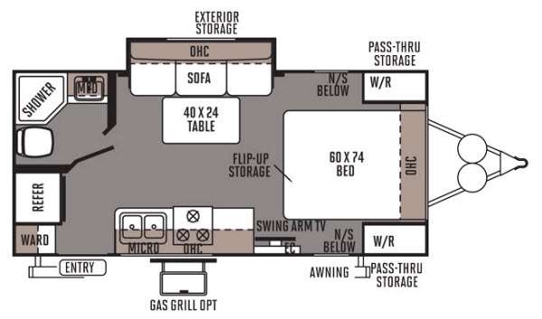 There are plenty of overhead cabinets throughout the travel trailer, as well as an exterior pass thru storage.