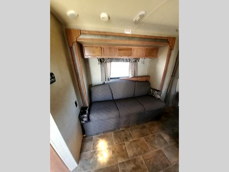 The sofa is on a slide and there is a table in front of the sofa. The opposite side of the travel trailer has a double kitchen sink, three burner range, microwave, and extra counter space. You will also find a swing arm TV.