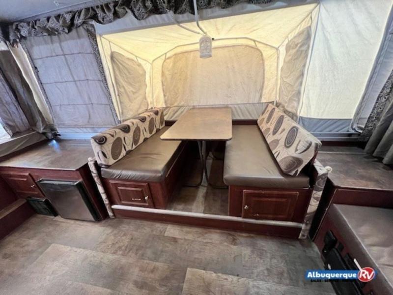 As you continue around, a slide out houses a booth dinette with the water heater under a booth seat. Back inside the pop-up camper is a cabinet with three burner stove top. An optional refrigerator and optional 20,000 BTU furnace could be included here as well.