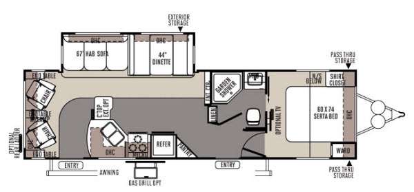 There are plenty of overhead cabinets throughout the trailer as well as exterior storage and an optional outside grill, and an optional rear ladder.