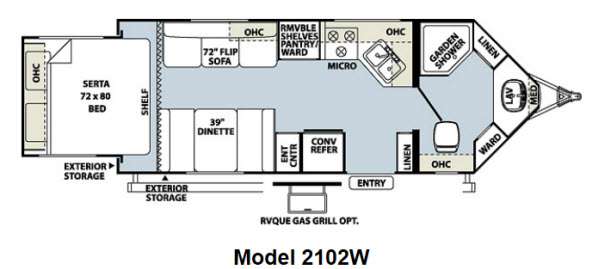 Single Slide Wind Jammer Expandable Travel Trailer, Rear King Bed Slide w/Overhead Cab. & Shelf, Flip Sofa w/Overhead Cab., Booth Dinette, Ent. Ctr., Conv. Refrig., Removable Shelves Pantry/Ward., 3 Burner Range w/Micro. Above, Dbl. Kitchen Sink, Overhead Cab., Linen, Front V-Nose Bath w/Corner Shower, Linen, Ward., Lav. w/Med. Cab., Toilet, Linen, Ext. Storage, Awning and More. Available Options May Include: Gas Grill.