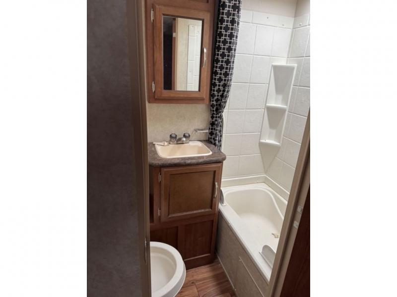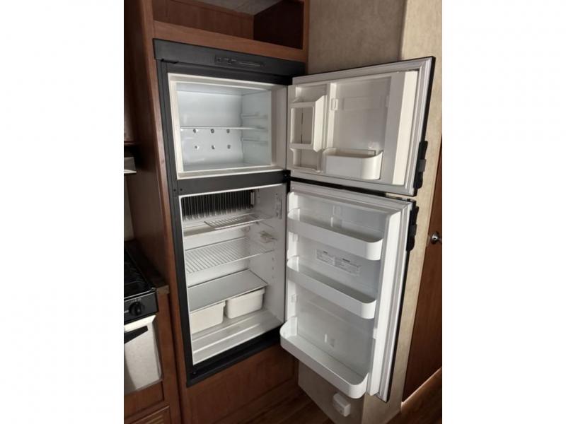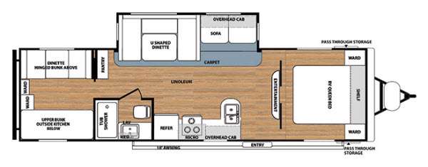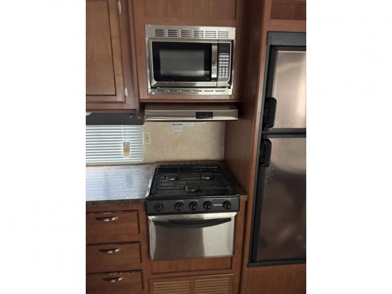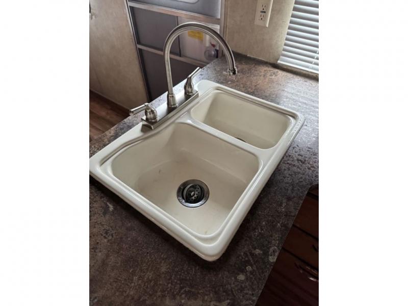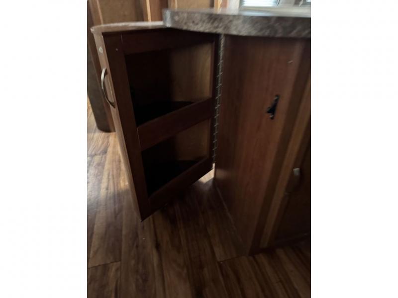 The main living and kitchen areas have a slide with a sofa and u-dinette. Next to the dinette is a pantry. On the opposite side of the travel trailer there is a double kitchen sink, three burner range, microwave, and refrigerator. In the front of the living/kitchen area is a nice size swivel box which you are sure to enjoy watching TV on.