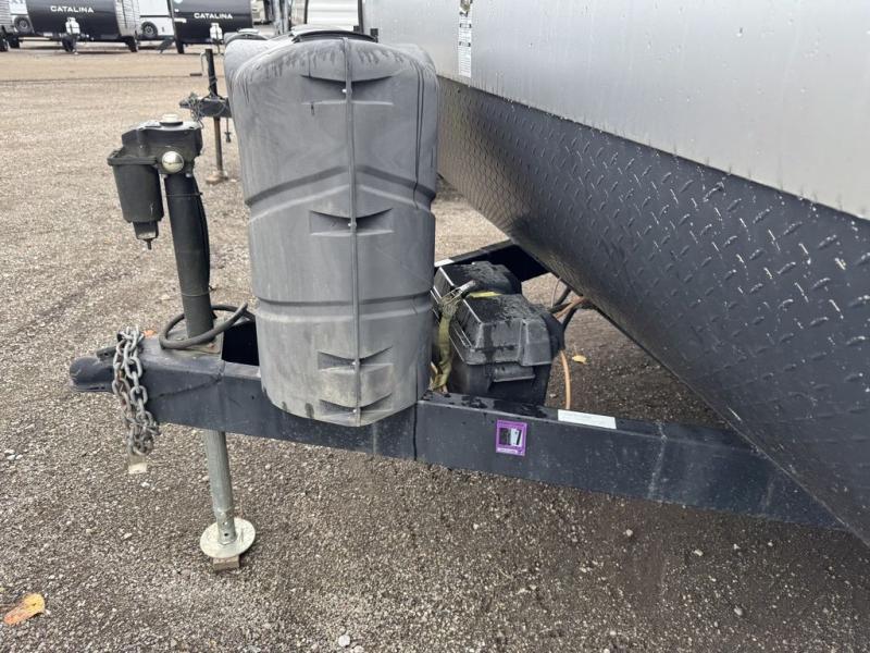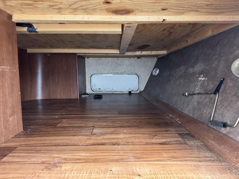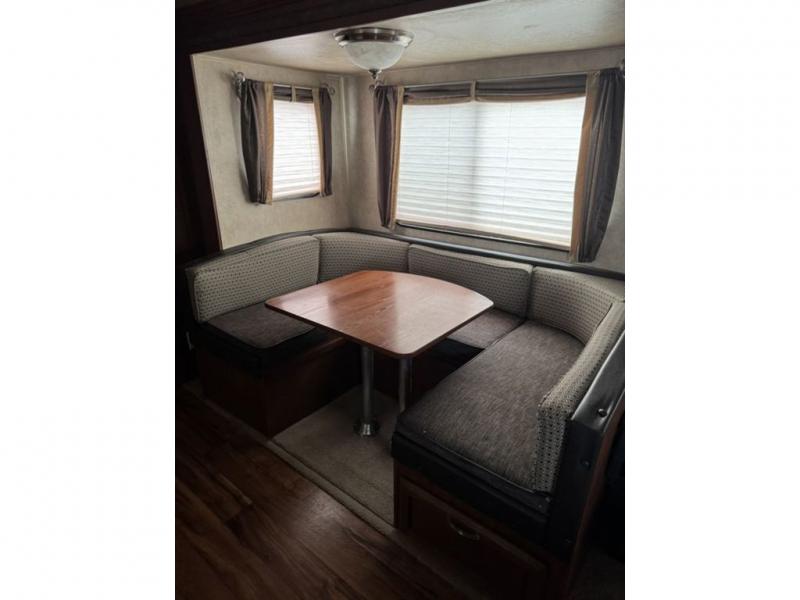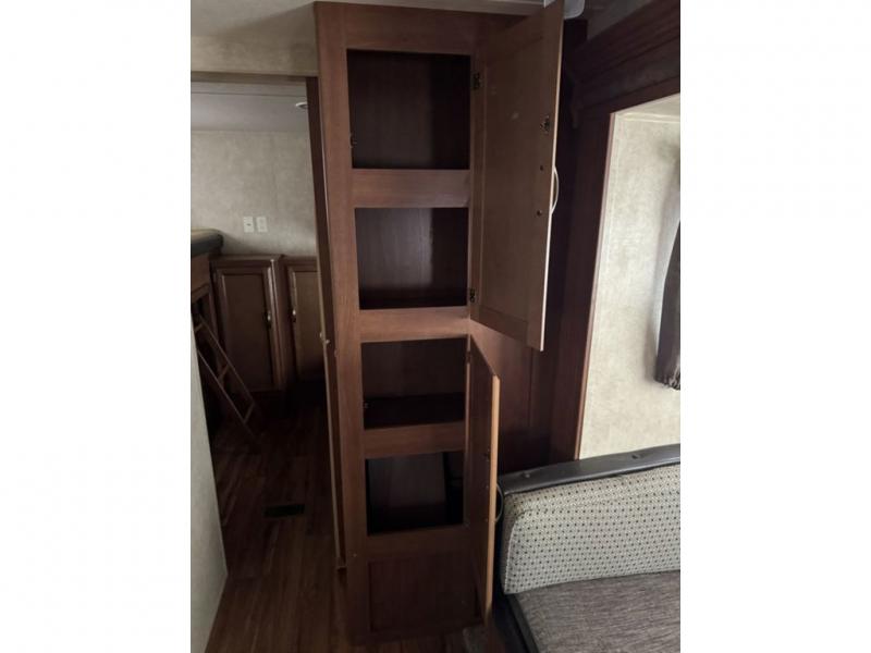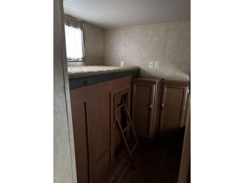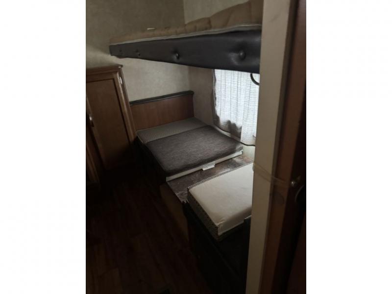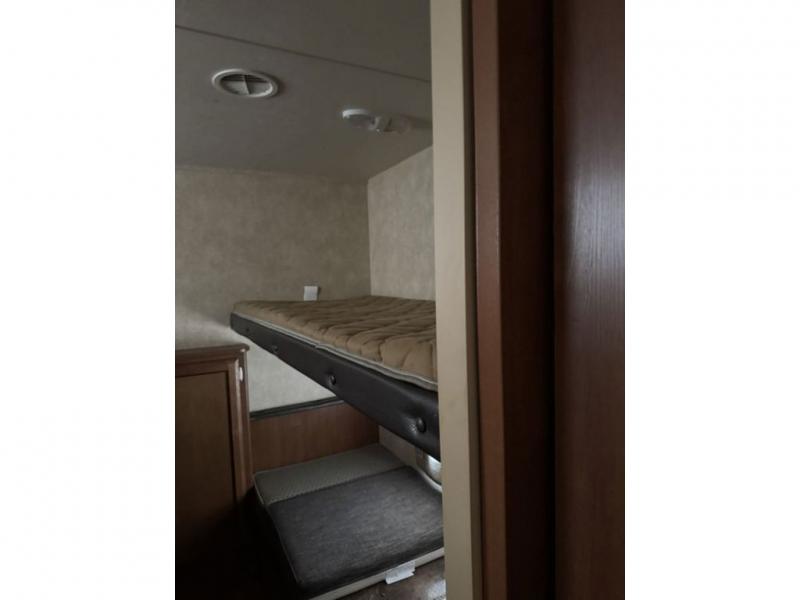 In the rear you will find the bunk house with a dinette and a hinged bunk above the dinette. On the opposite side of the trailer there is an upper bunk. The room also has two wardrobes for extra storage.