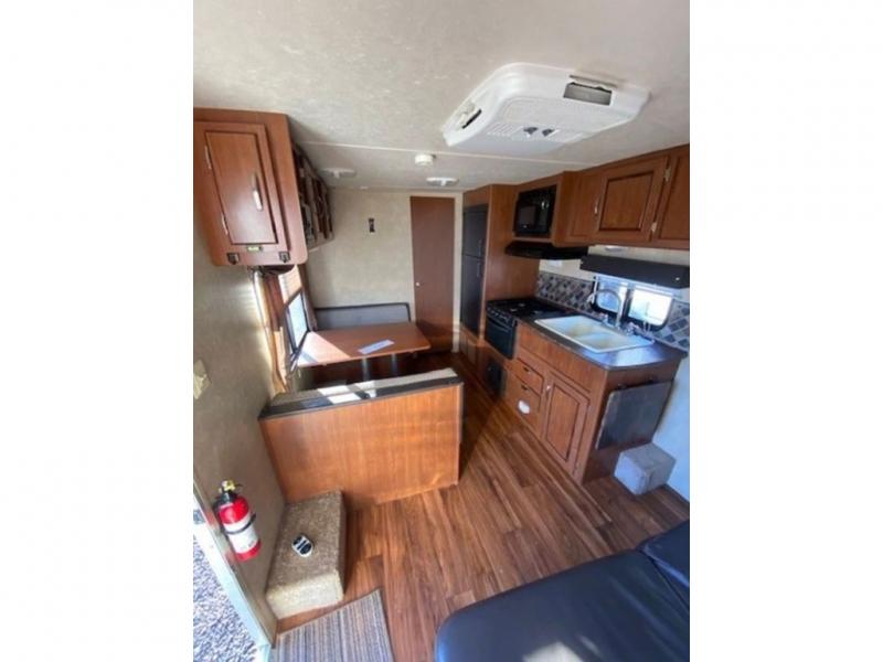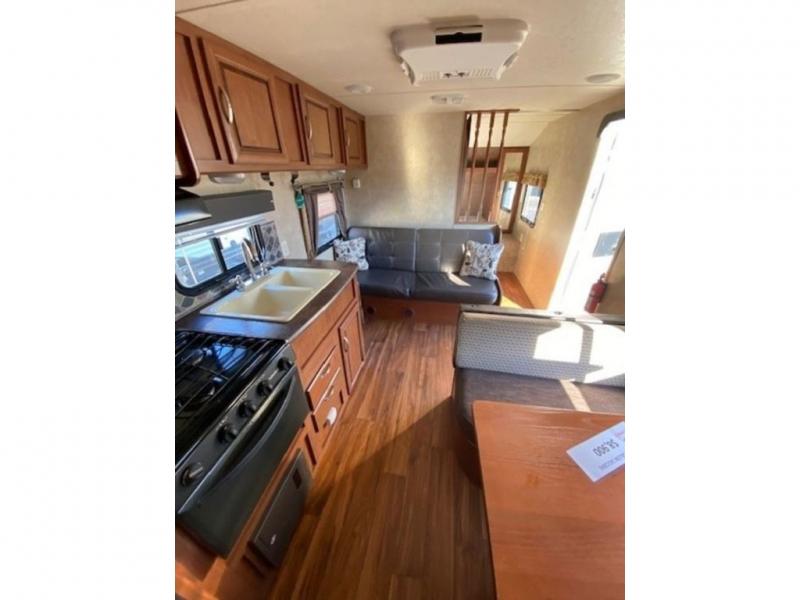 As you enter the travel trailer, to the left there is a dinette. On the opposite side of the trailer you will find a refrigerator, three burner range, microwave, and double kitchen sink. There is also a sofa in the main living area.