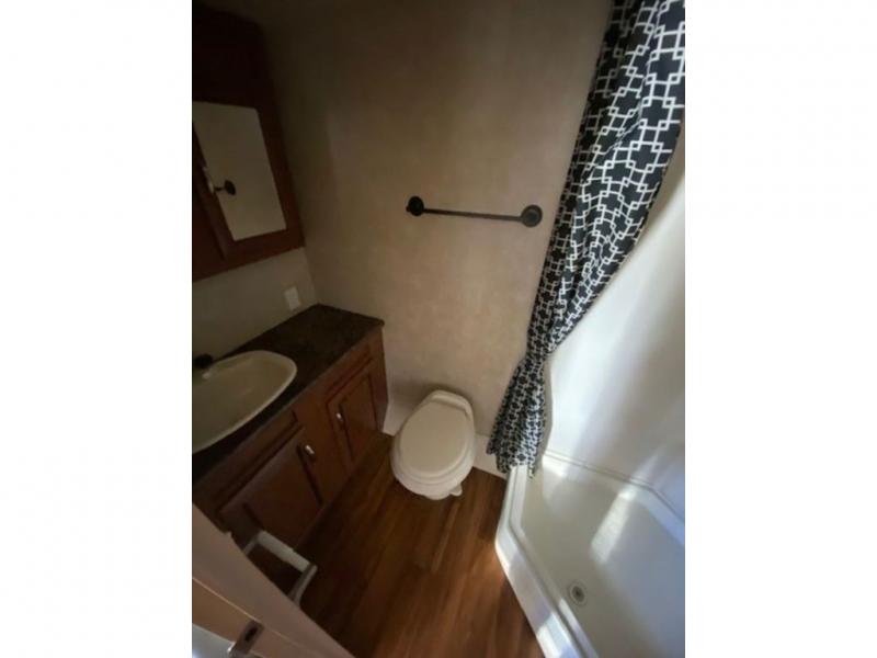 In the rear of the trailer you will find a bathroom with a neo-angle shower, toilet, sink, and medicine cabinet.