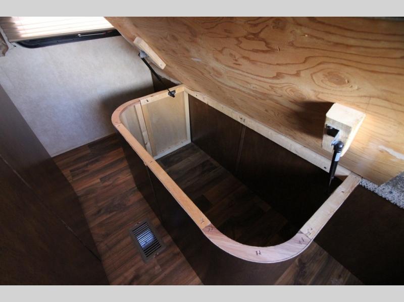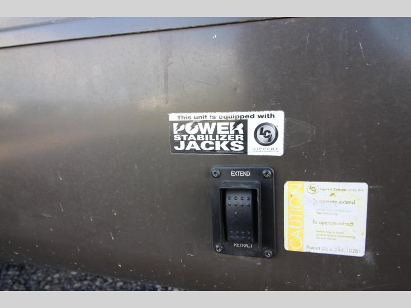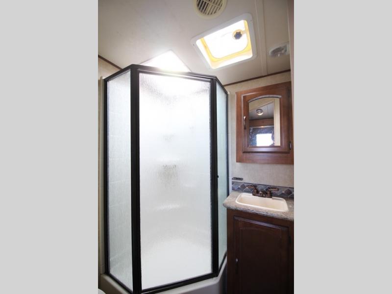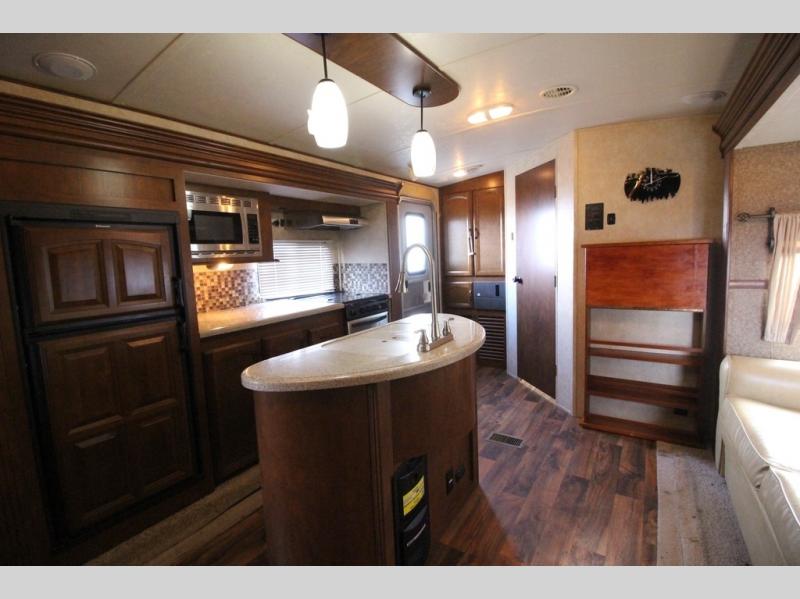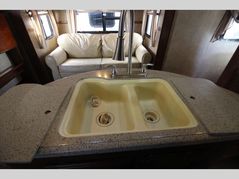 Inside the bathroom you will find a toilet, neo-angle shower, sink, and medicine cabinet. One side has a hide-a-bed sofa and removable table. The other slide offers a triple burner range, microwave, and refrigerator. You are also sure to enjoy the kitchen island with the double kitchen sink.