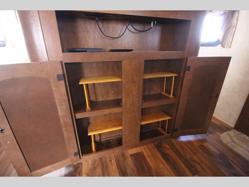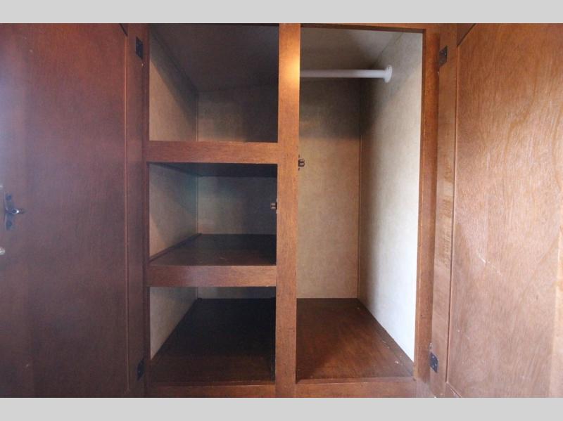 As you enter the travel trailer, the pantry and wardrobe are on the left.