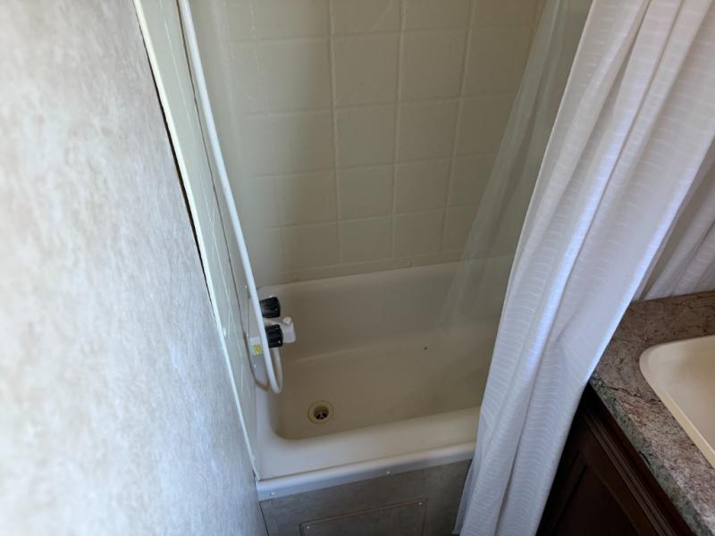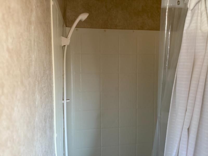 In the rear, you will find a bathroom just off of the bunk house. There is a toilet, sink, medicine cabinet, and tub. There is also a private entrance outside from the rear bathroom.
